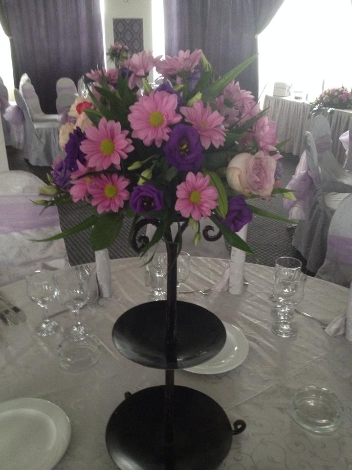 Aranjament floral pentru mesele invitatilor compus din trandafir si crizantema margareta, culori la alegerea clientului, verdeata decorativa. Aranjamentul este foarte elegant, dimensiune mare si poate fi pus direct pe masa sau in suportul din fier forjat.