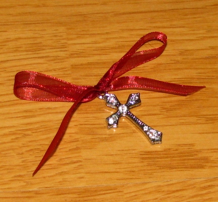 Cruciulite pentru botez din metal, culoare argintie, accesorizate cu fundita din organza diverse culori.