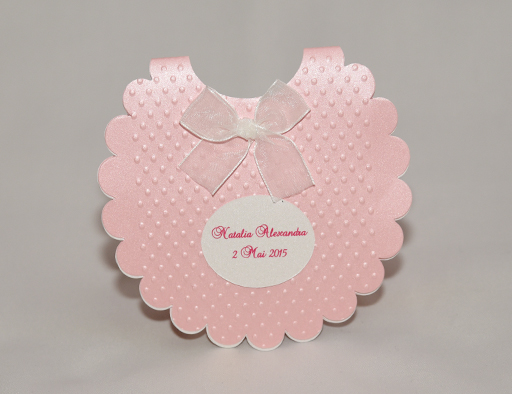 Invitatie botez handmade stil babetica alcatuita din doua parti: o babetica exterioara din carton roz si o babetica interioara din carton alb pe care este printat textul invitatiei si optional poza bebelusului, iar pe exterior, este aplicata eticheta cu numele bebelusului si data evenimentului si babetica are pe centru o fundita din organza alba