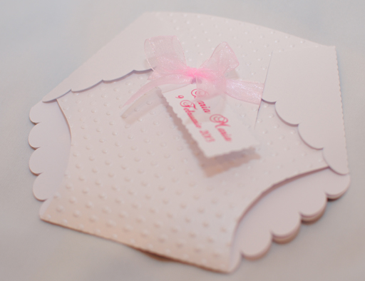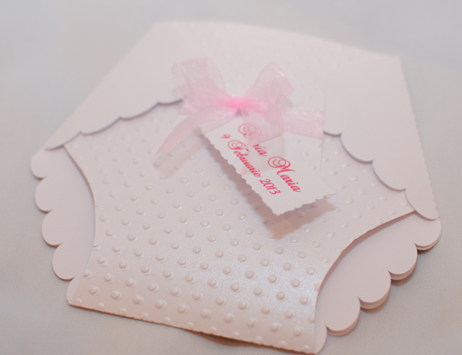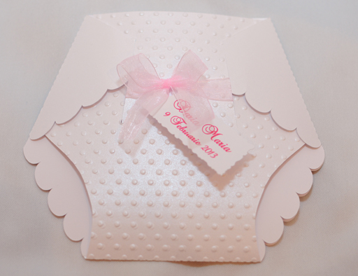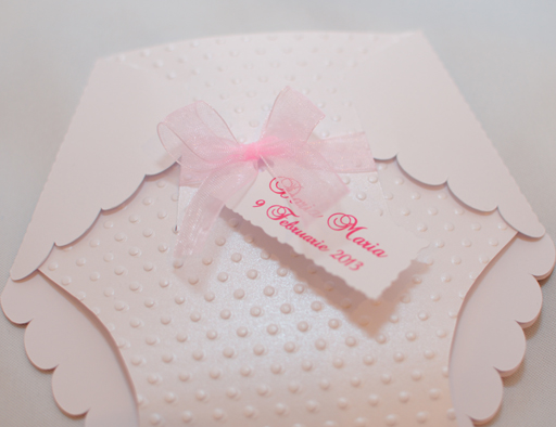 Invitatie botez fetita in forma de pampers alcatuita din scutecel din carton alb sidefat embosat cu punctulete, in interior cartonas cu textul invitatiei si scutecelul este prins cu fundita roz si eticheta cu numele bebelusului si data evenimentului