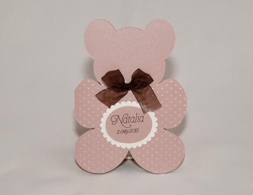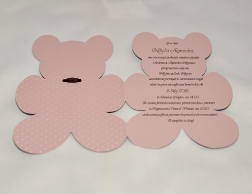 Invitatie botez handmade in forma de ursulet, realizata din carton roz, embosat cu punctulete si personalizata cu eticheta cu numele bebeluslui si data botezului si fundita alba organza