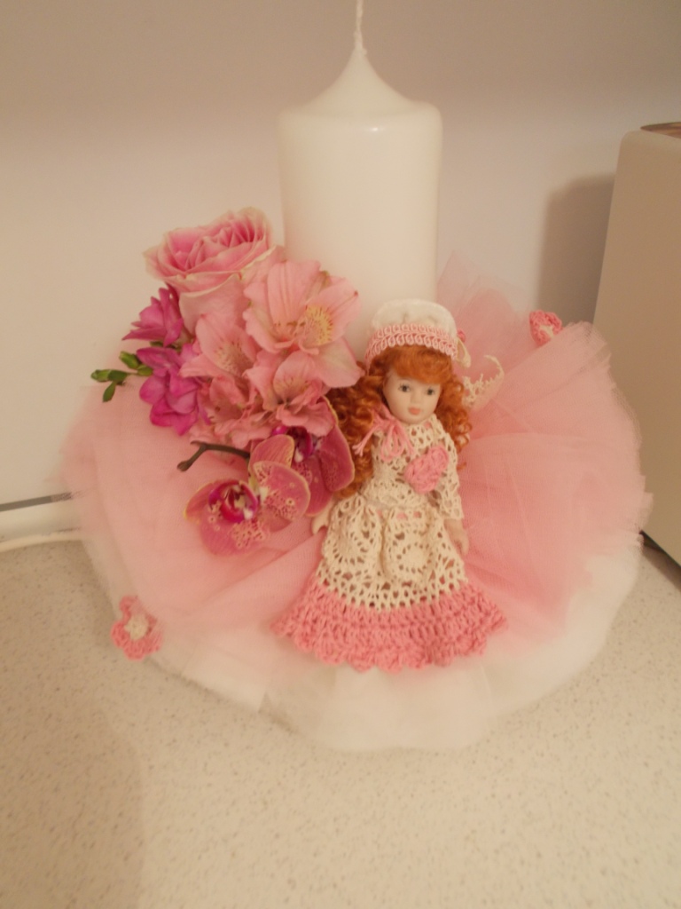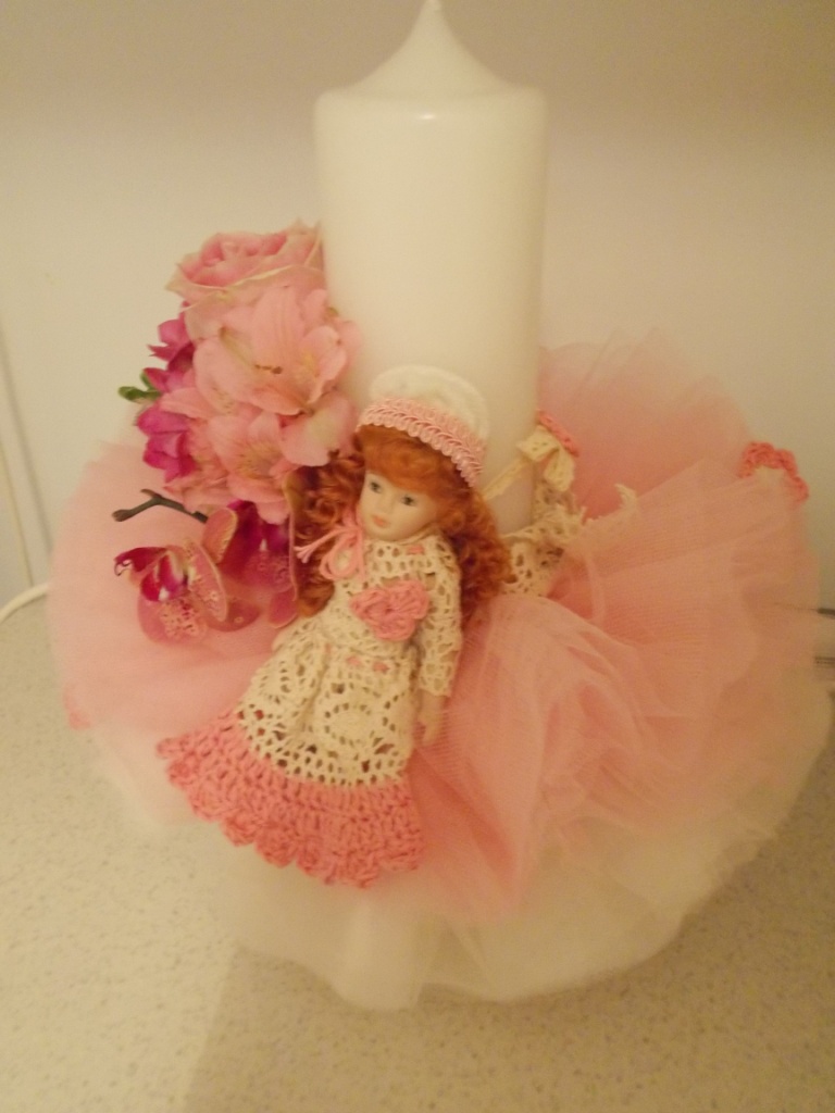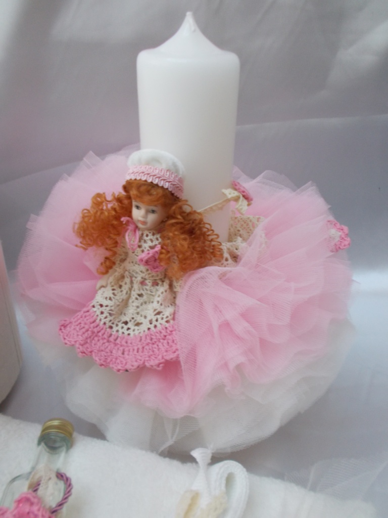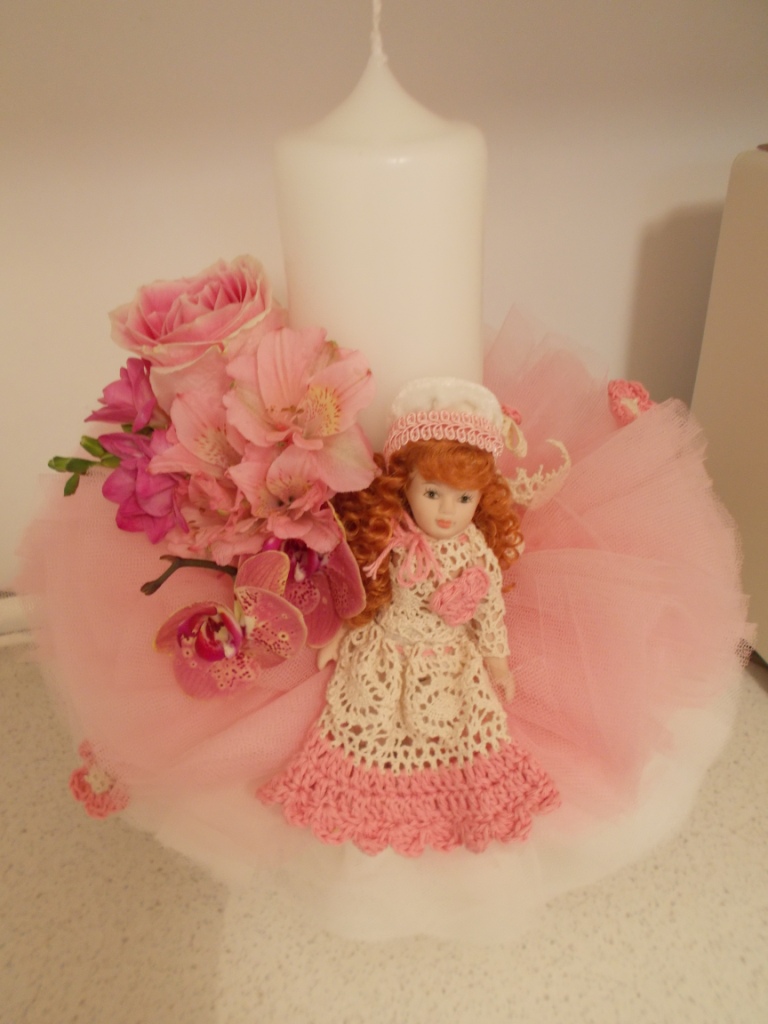 Lumanare pentru botez cu flori naturale, culori roz, temarica vintage, cu pampon din tule si papusica cu rochita crosetata manual.