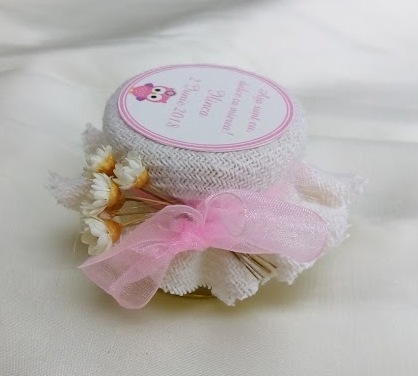 Personalziarea se face pe capac cu un biletel rotund, din carton, imprimat si lipit, pe biletele se imprima un mesaj, numele si data evenimentului sau data nasterii si o bufnita roz