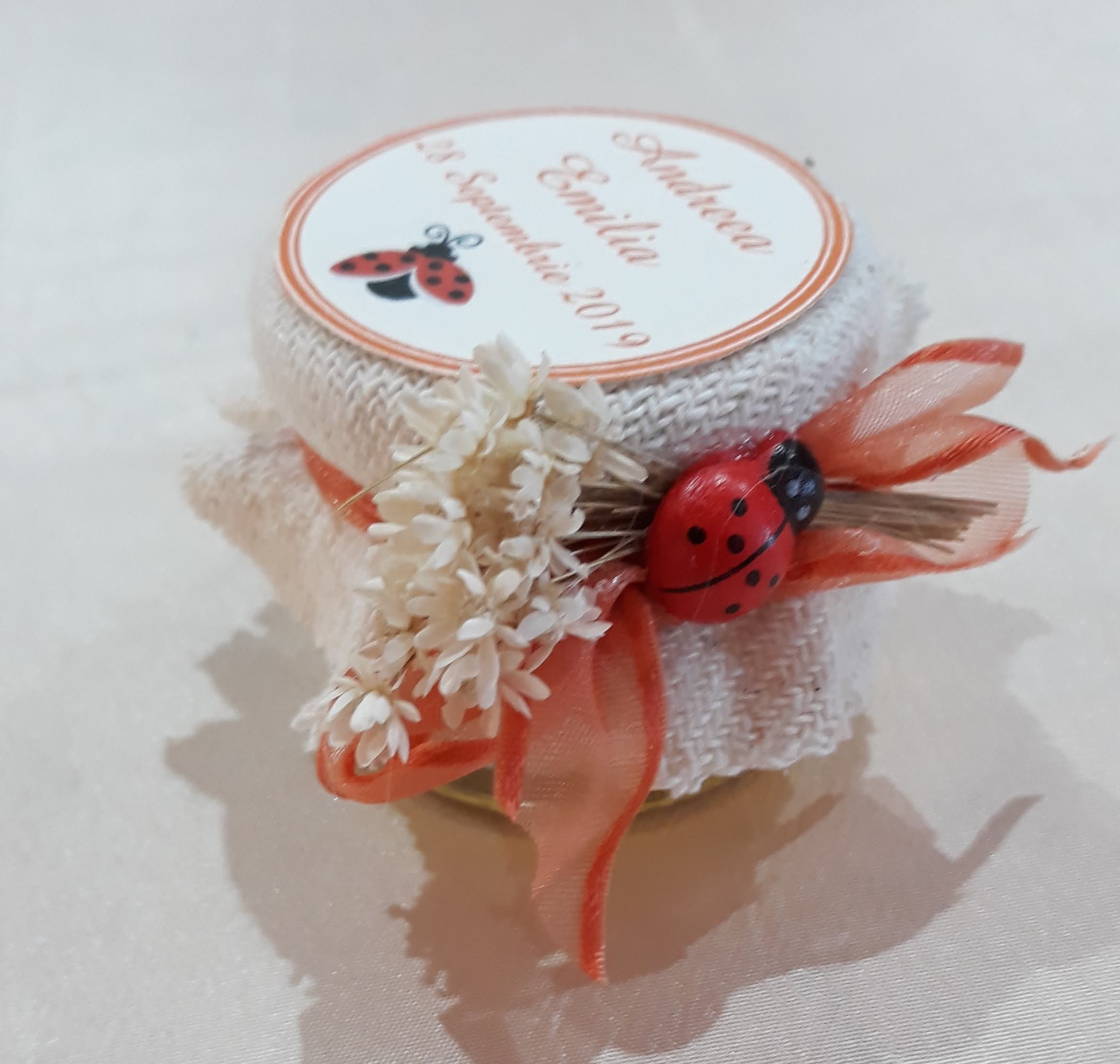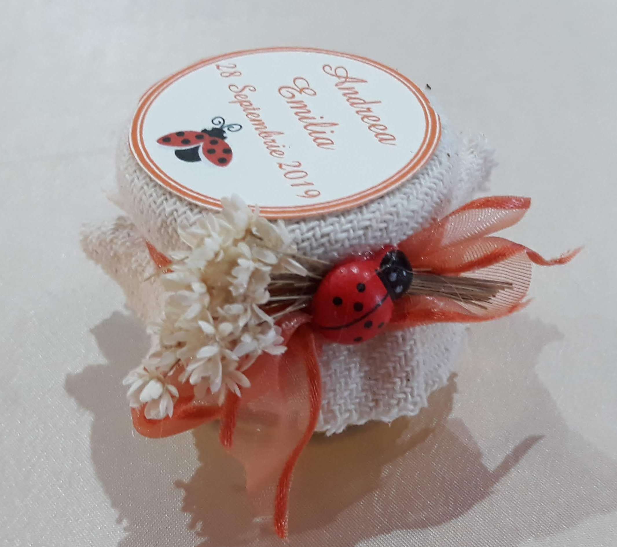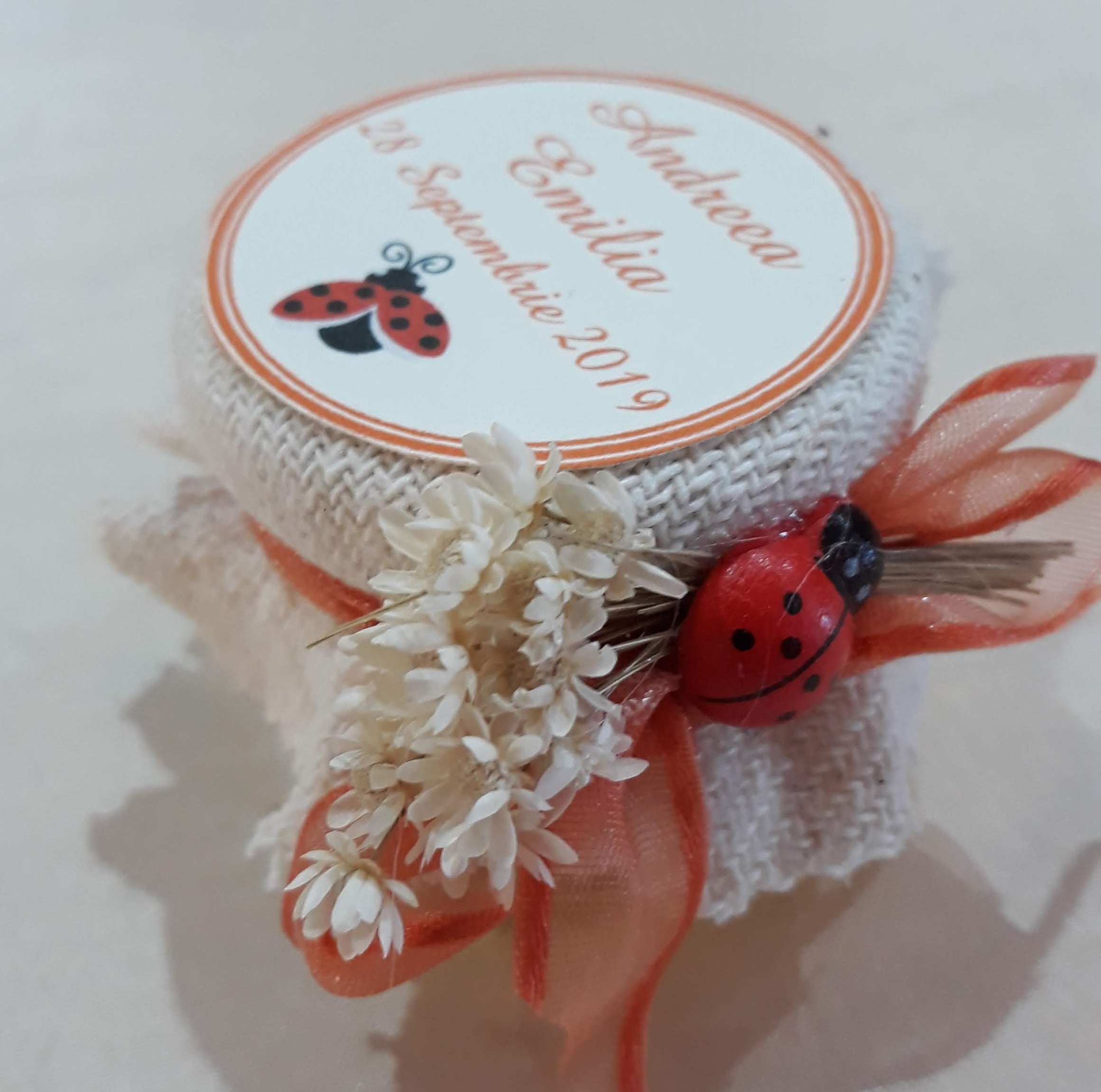 Pe capac se aplica un biletel rotund, imprimat cu mesaj, numele bebelusei, data evenimentului sau data botezului, la alegerea dvs. si o buburuza