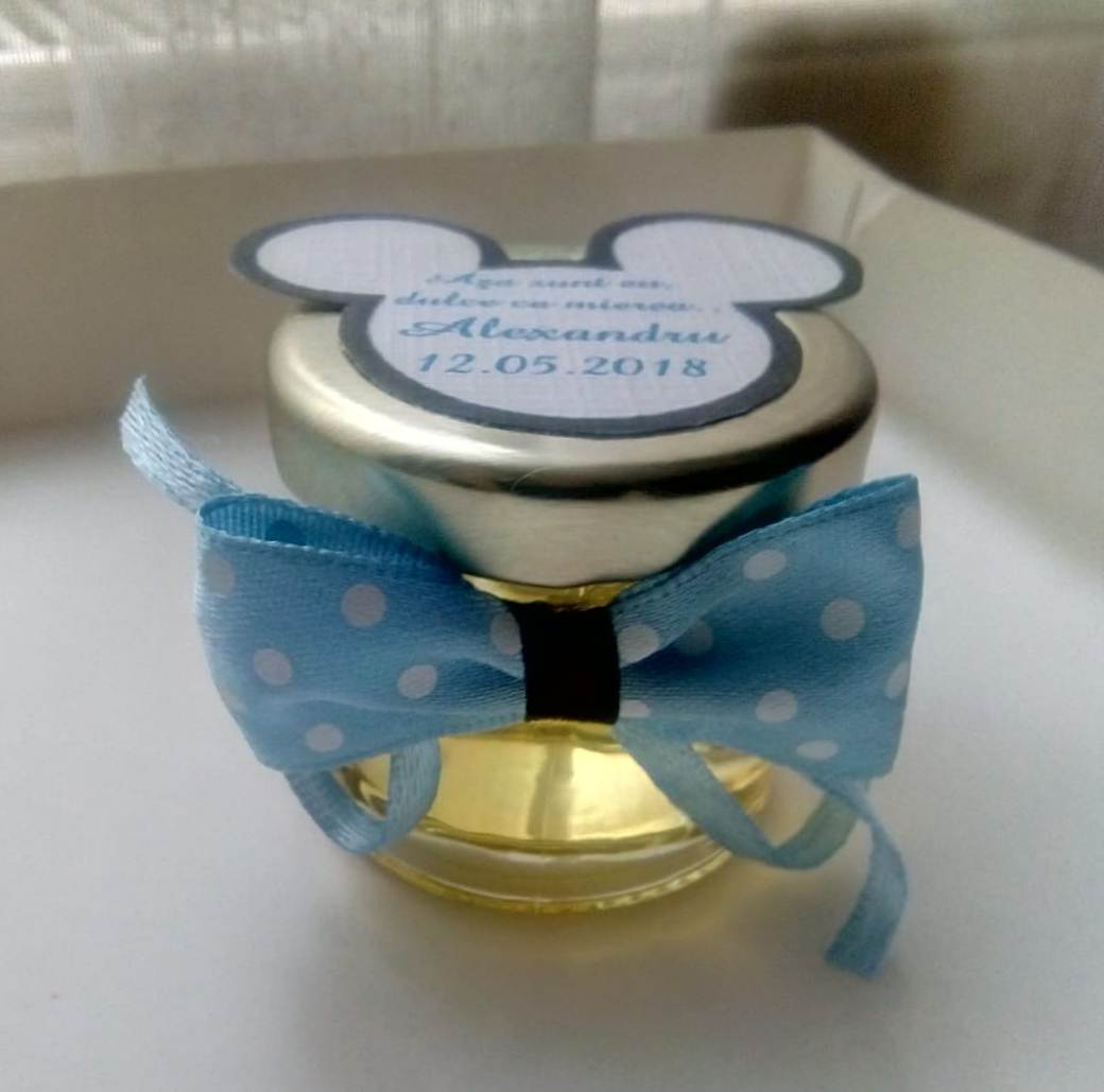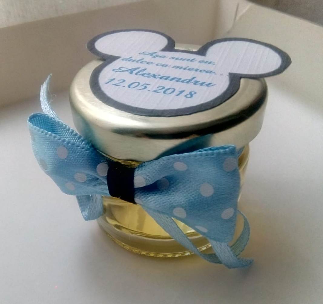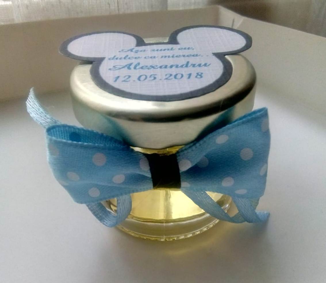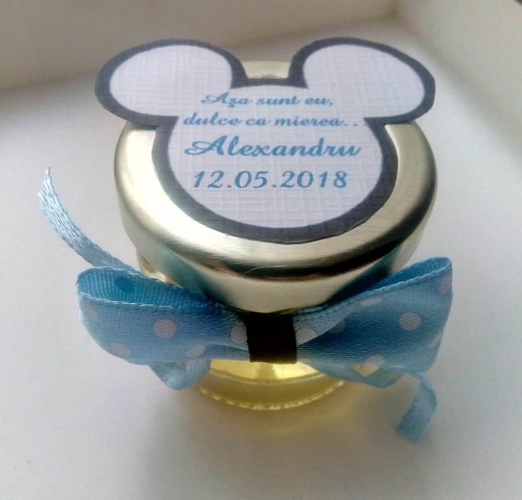 Pe capac se lipeste un biletel de personalizare in forma capului lui Mickey Mouse, pe care se imprima un mesaj, numele copilasului si data evenimentului sau data nasterii