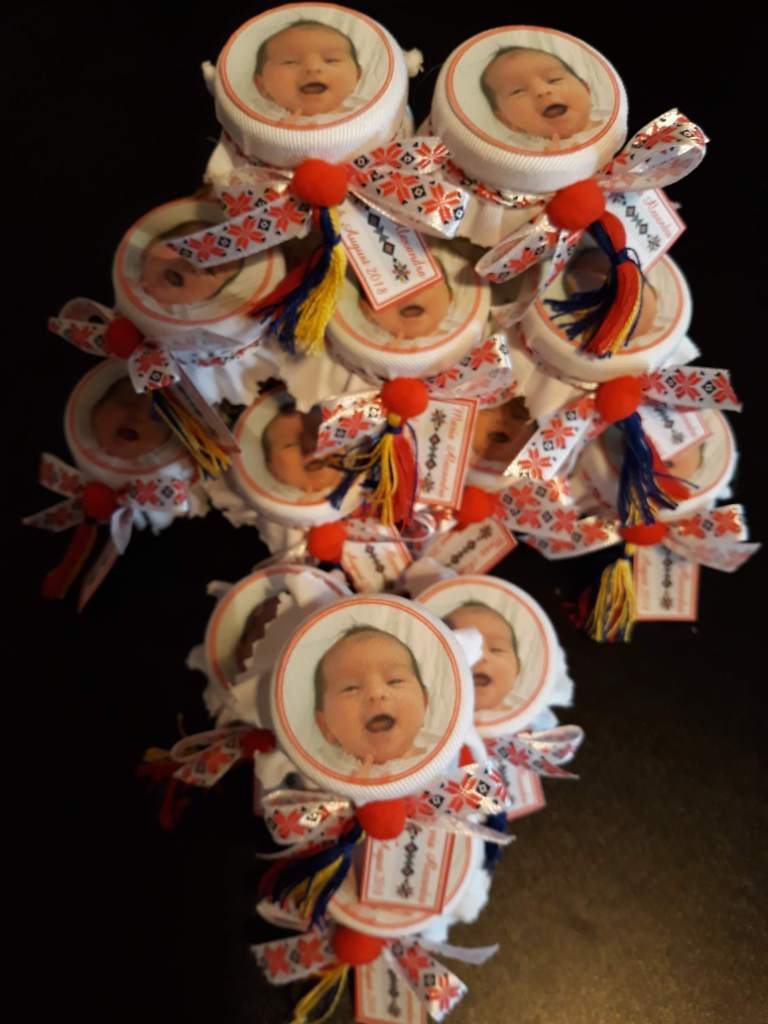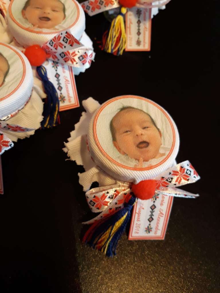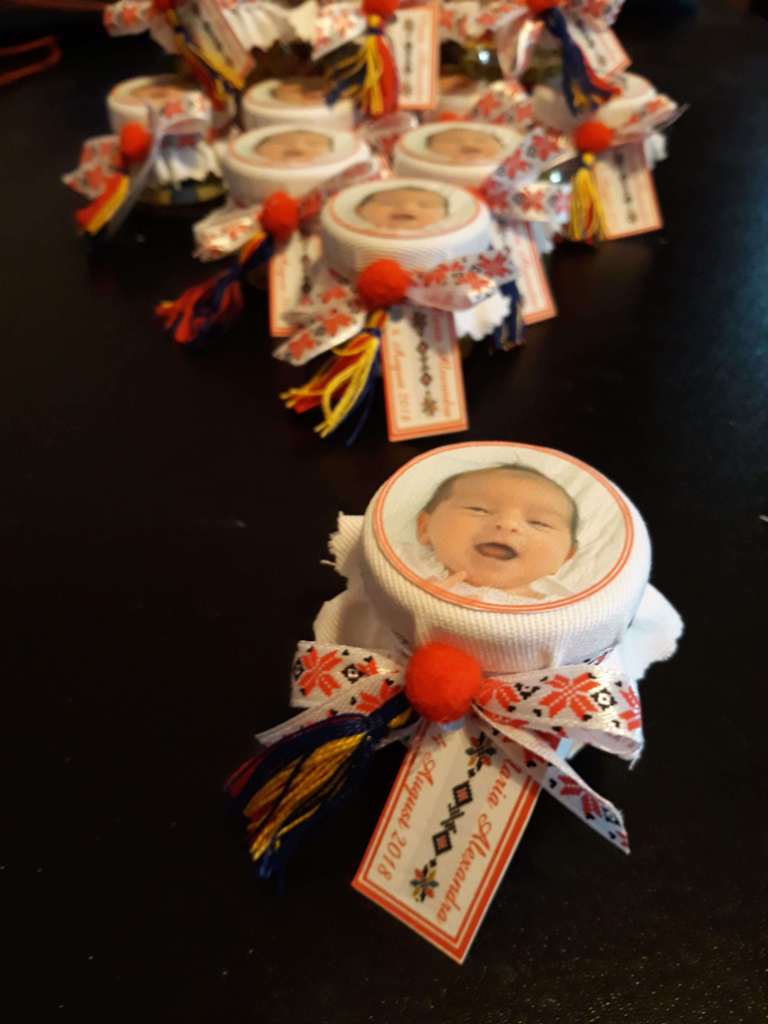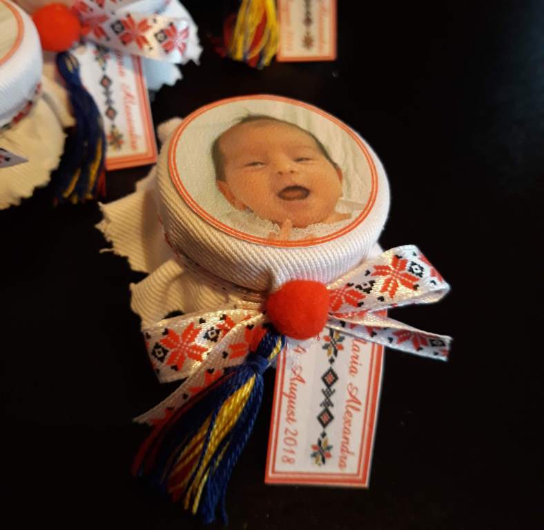 Marturie borcanel cu miere pentru botez fetita, decorat in tematica traditionala romaneasca si personalizat cu poza bebelusei