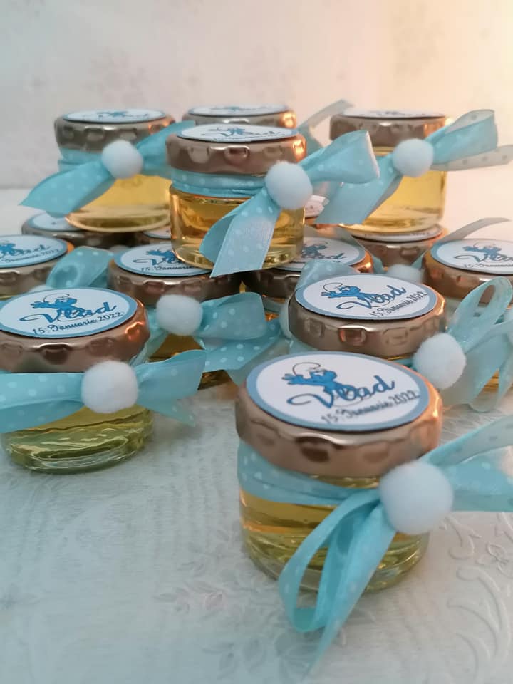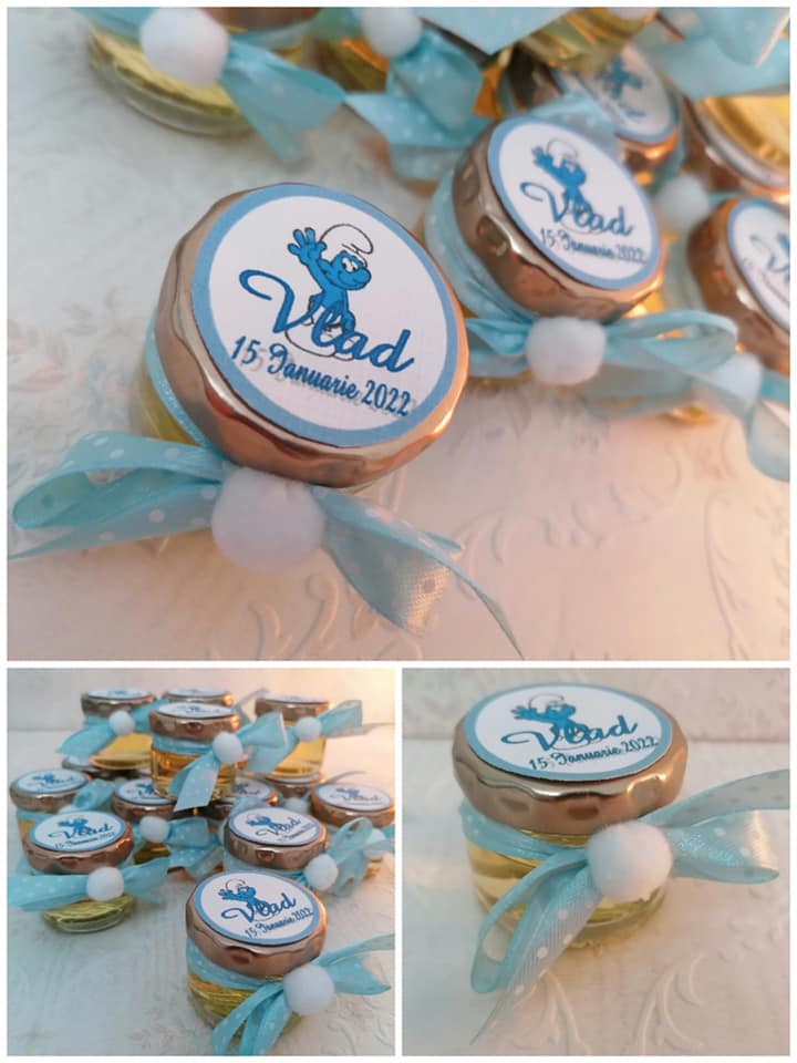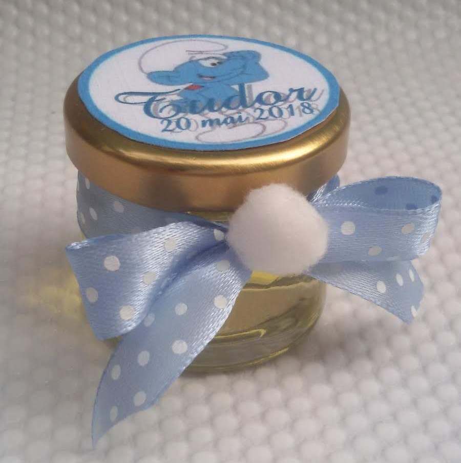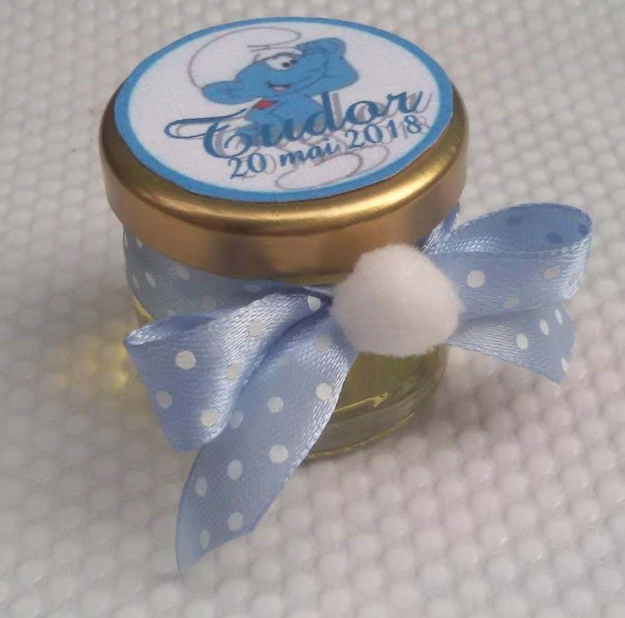 Marturie borcanel cu miere pentru botez baietel, tematica Strumf