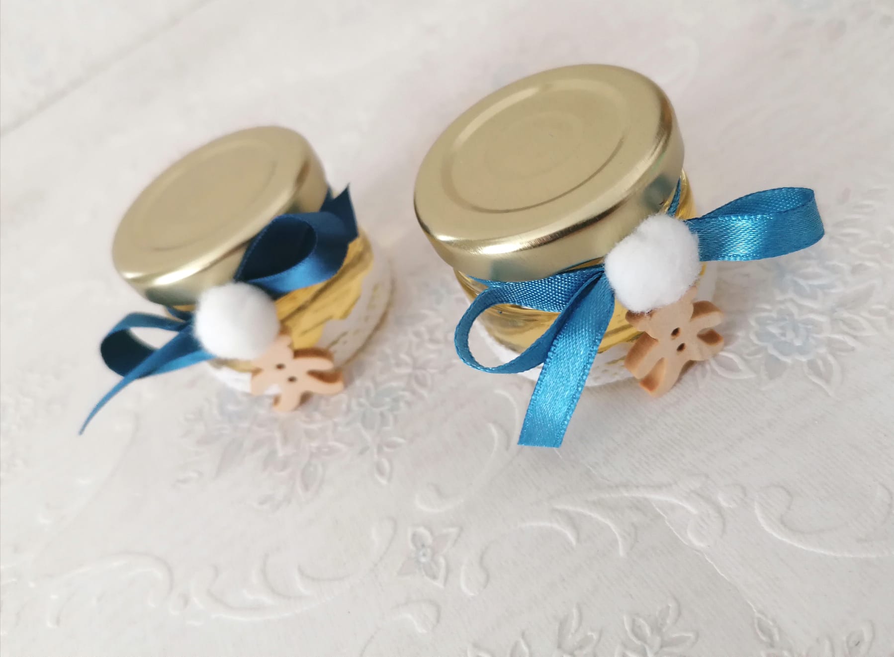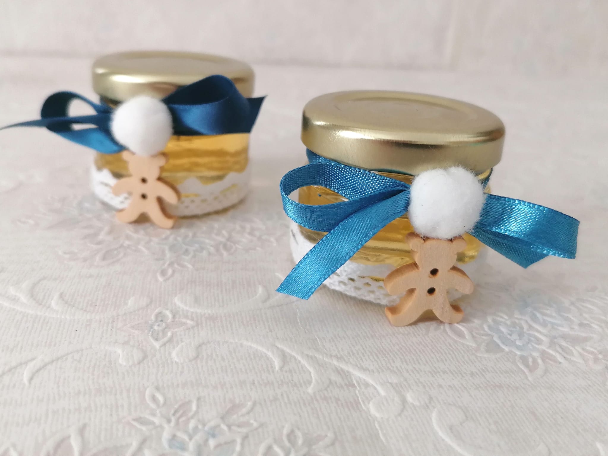 Borcanelul este decoar in partea de jos cu o banda din dantela din bumbac alba, la gatul lui este legata panglica din satin albastra, un ursulet si un ciucuras alb