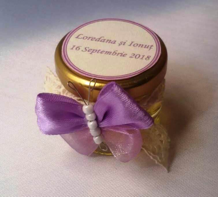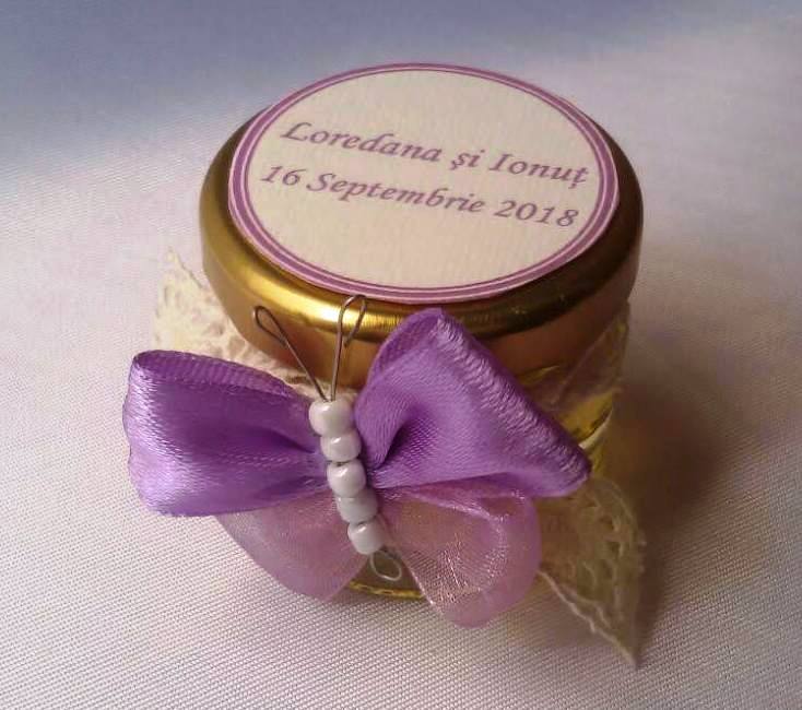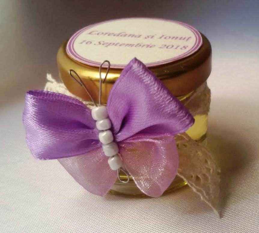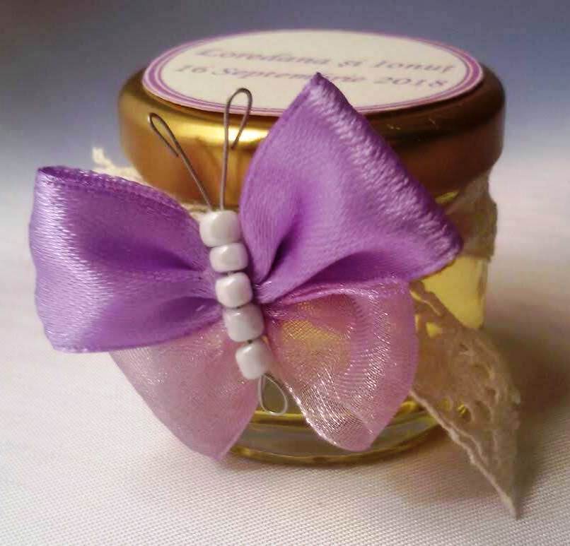 Marturie borcanel cu miere pentru botez fetita accesorizat cu un fluturas lila, realizat manual, cu margele, panglica si sarmulita