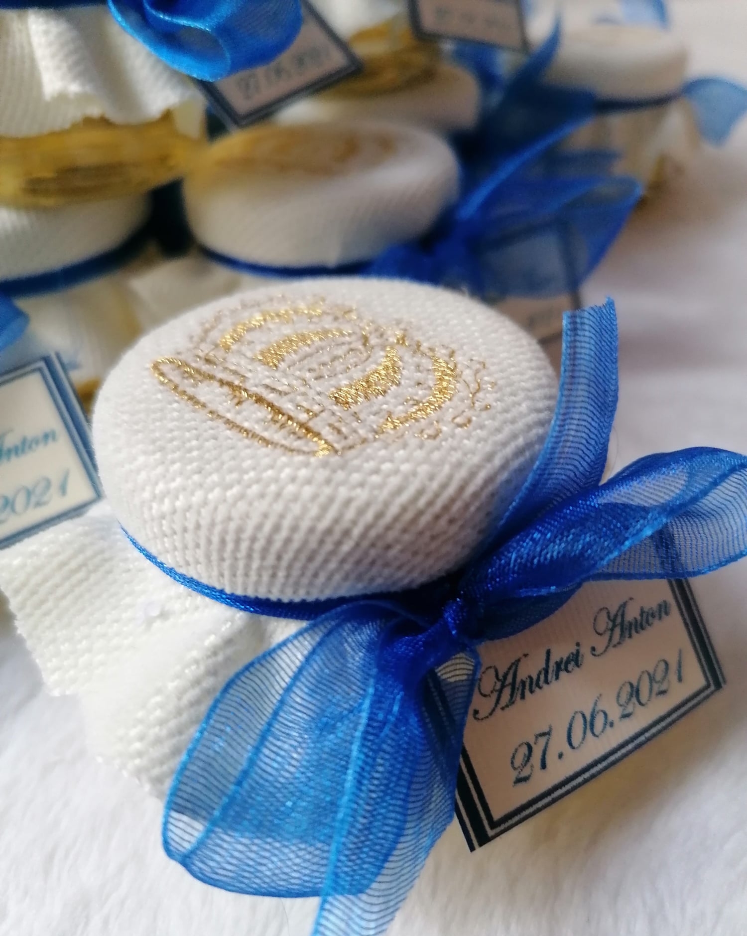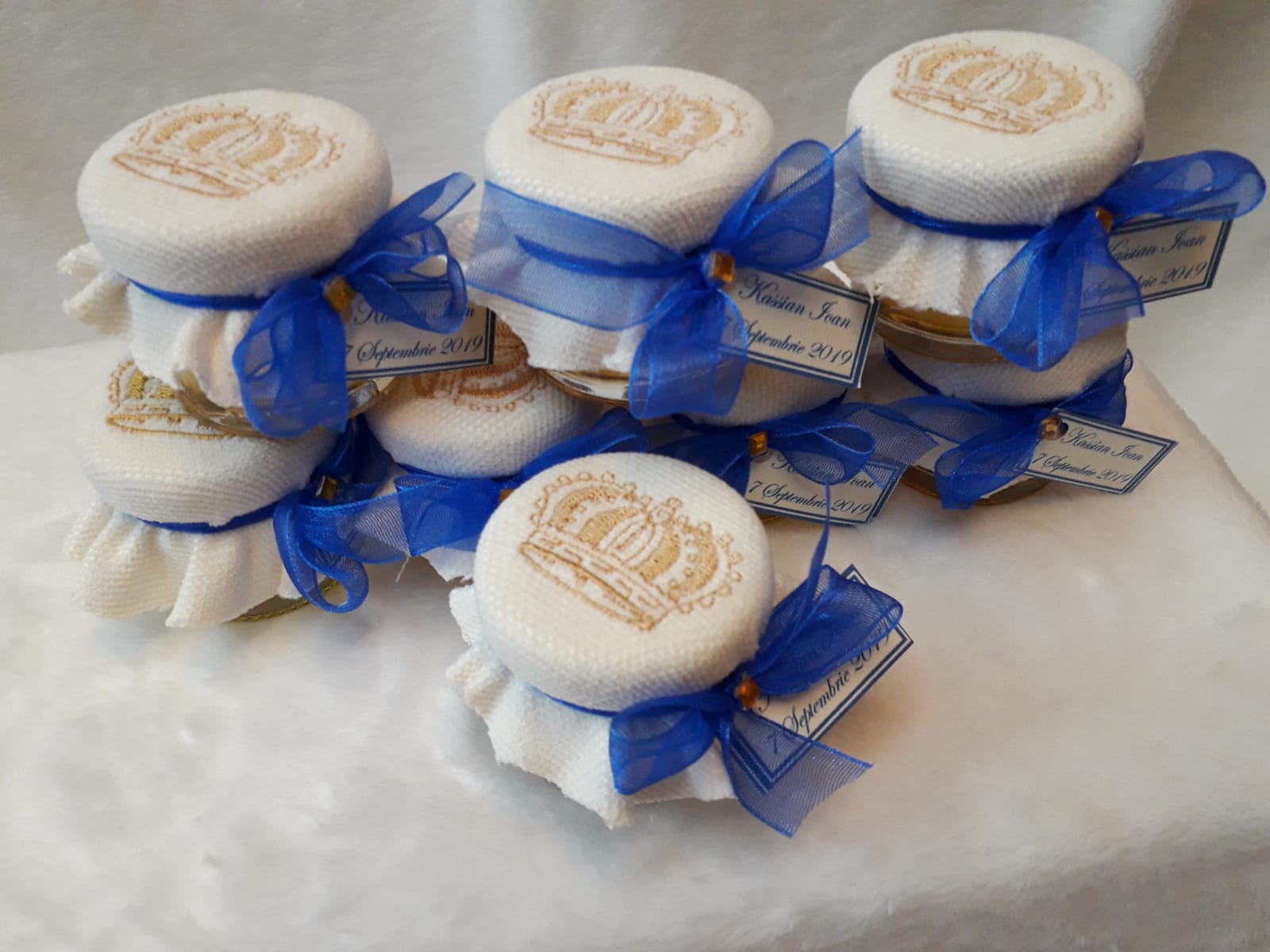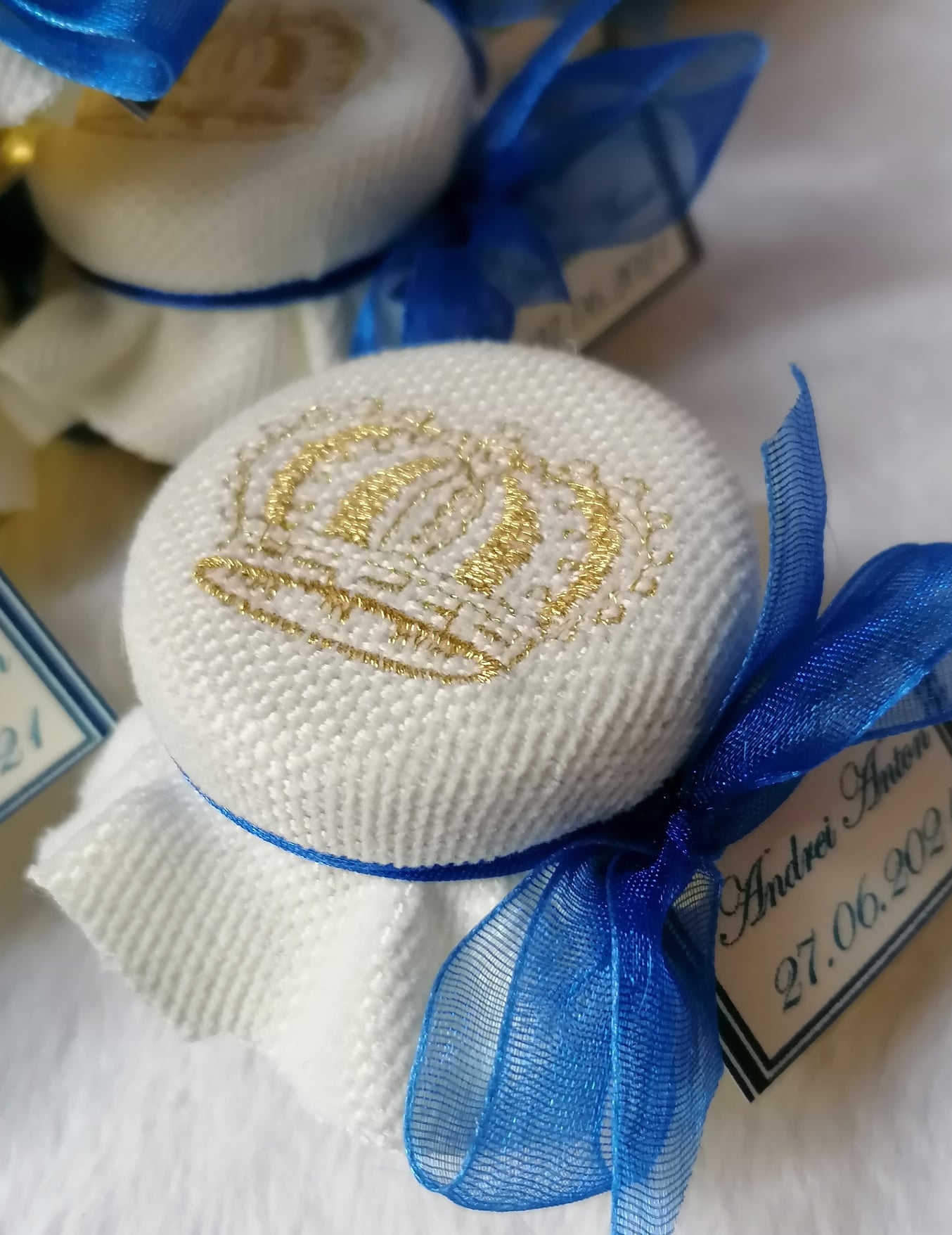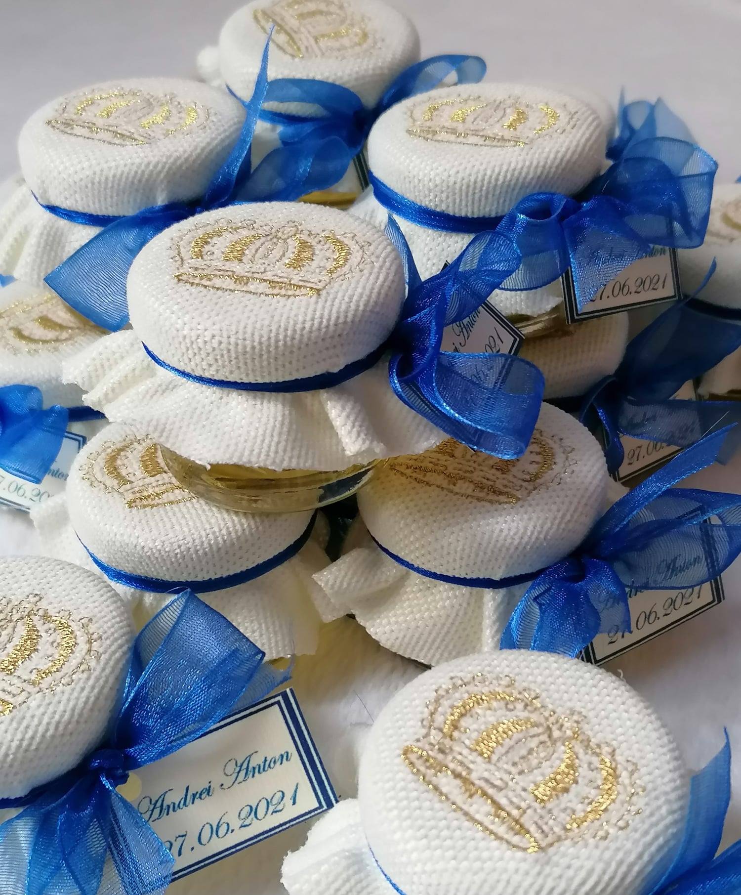 Capacul este imbracat in panza bordata cu o coroana de print aurie si legata cu panglica din organza albastra la care e atasat biletel de personalizare cu numele bebelusului si data evenimentului