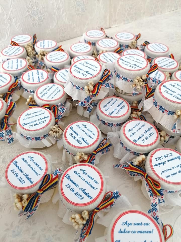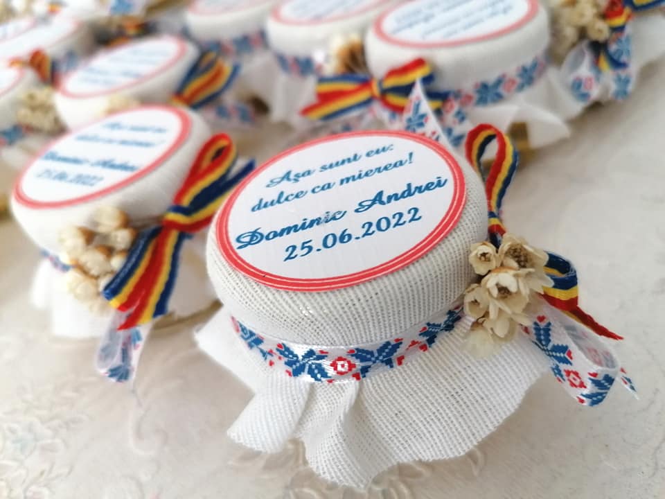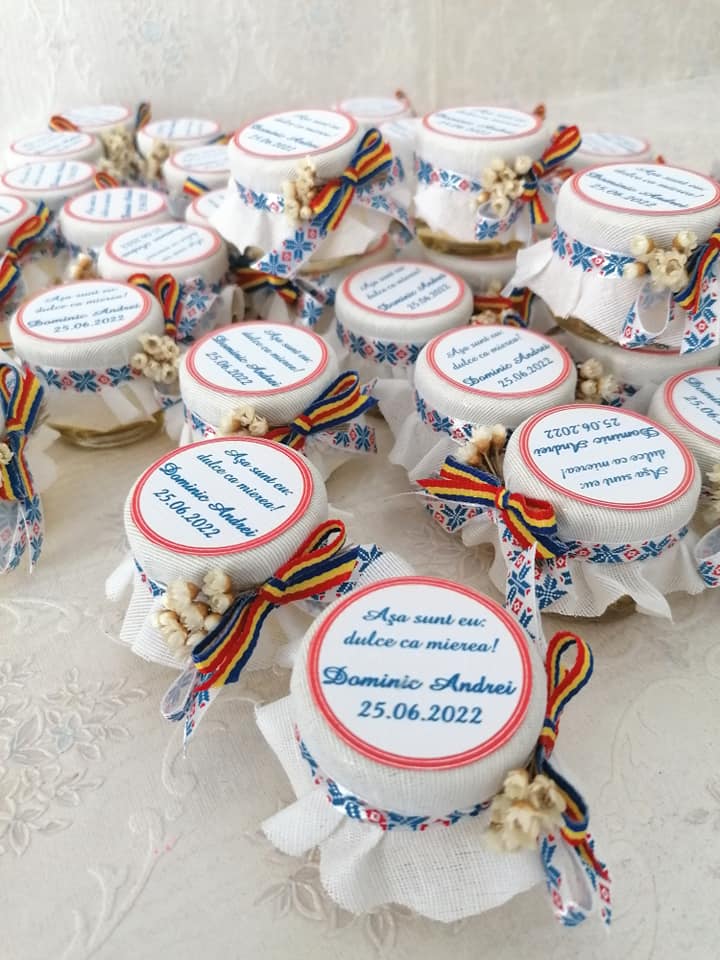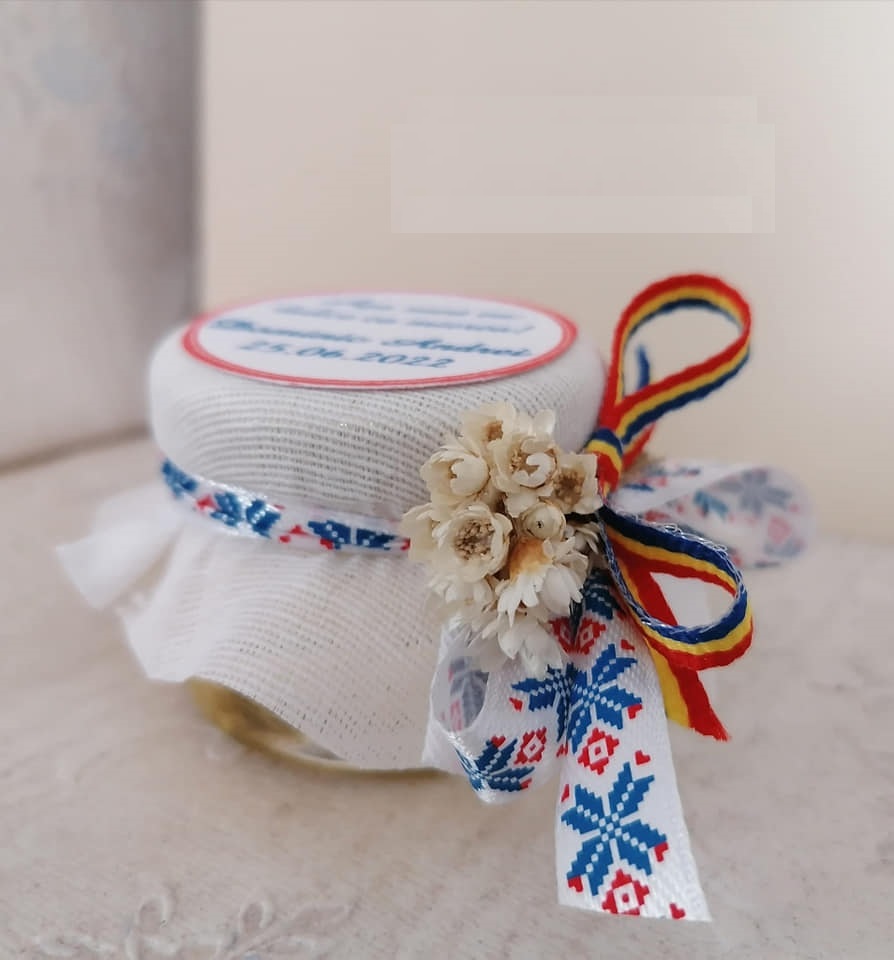Marturie pentru botez baietel borcanel cu miere, decorat in tematica traditionala romaneasca