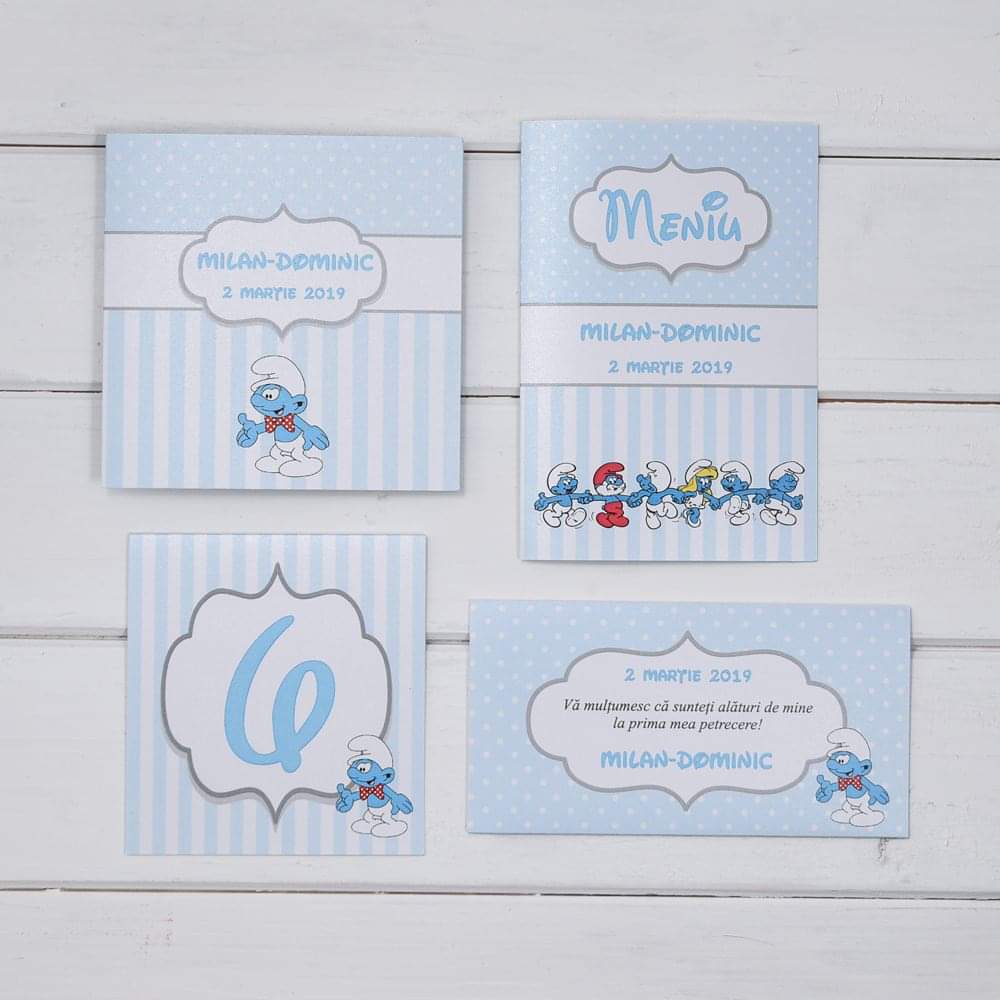 Card de masa pentru botez cu plic de bani tematica Strumfi