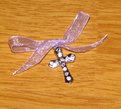 Cruciulite pentru botez din metal, culoare argintie, accesorizate cu fundita din organza diverse culori.