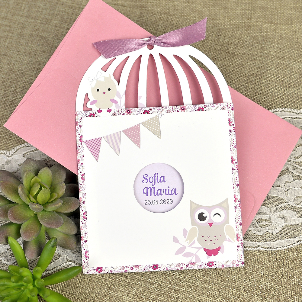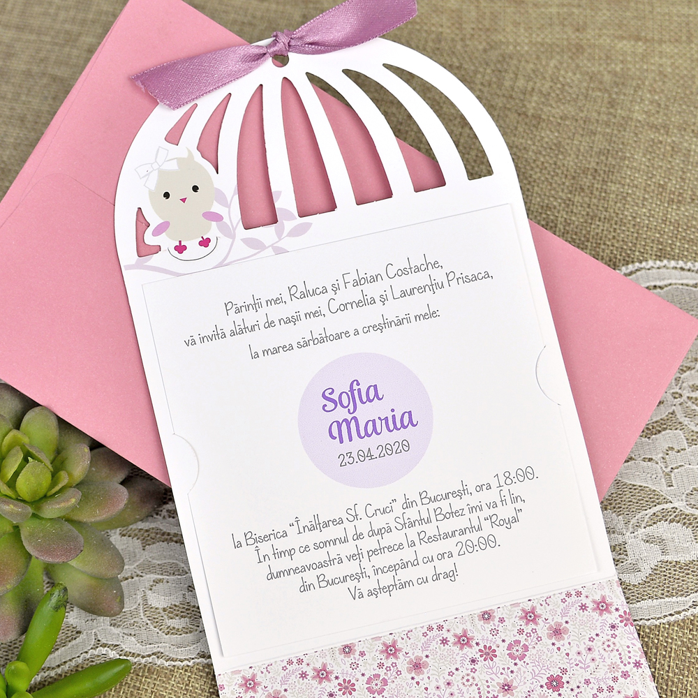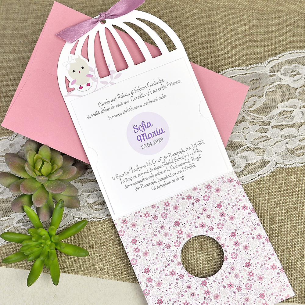 Invitatie pentru botez fetita in forma de colivie realizata din carton alb, personalizata cu o pasare cu fundita