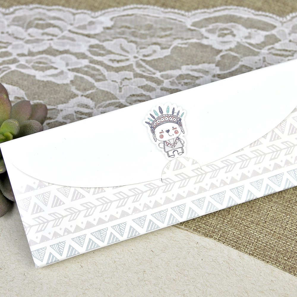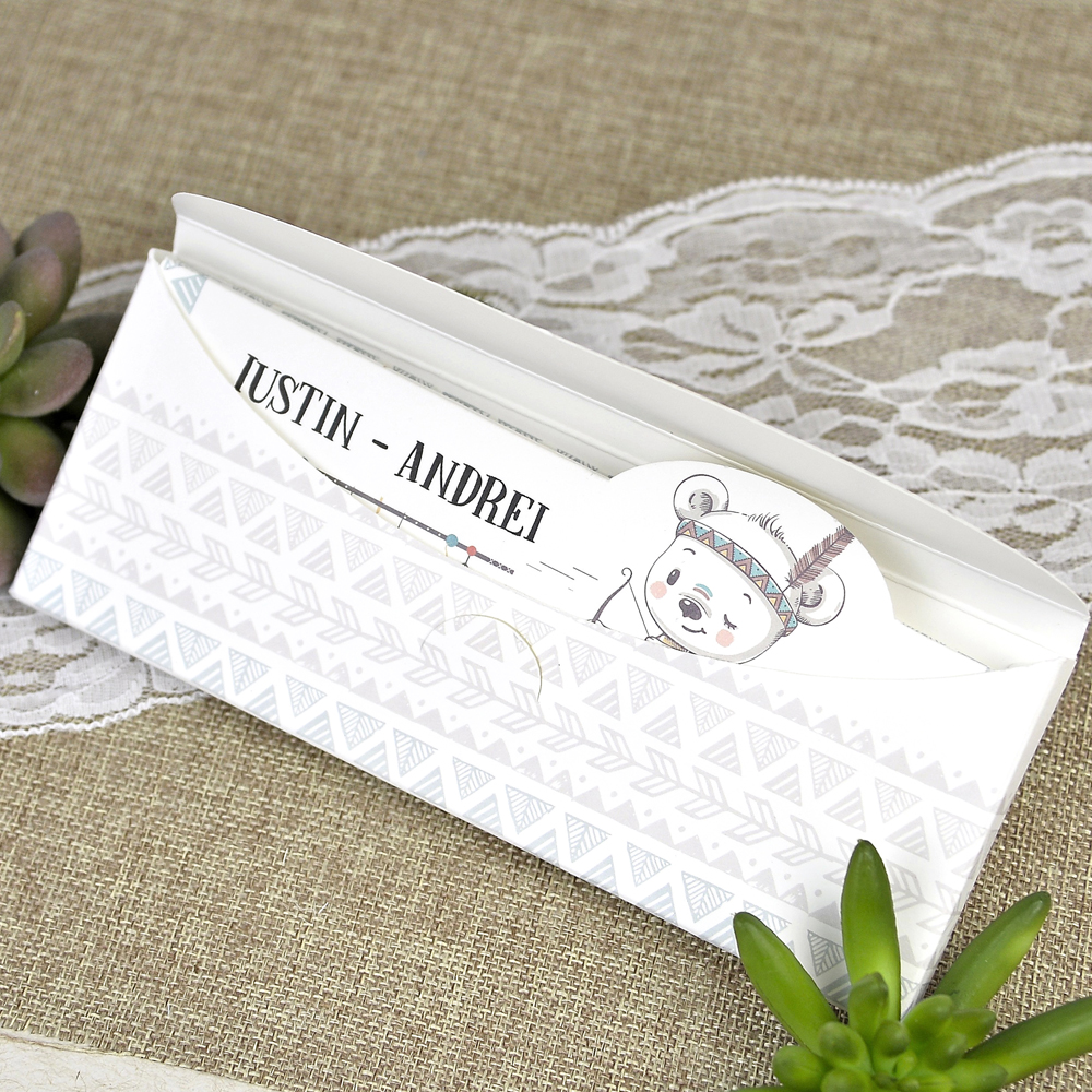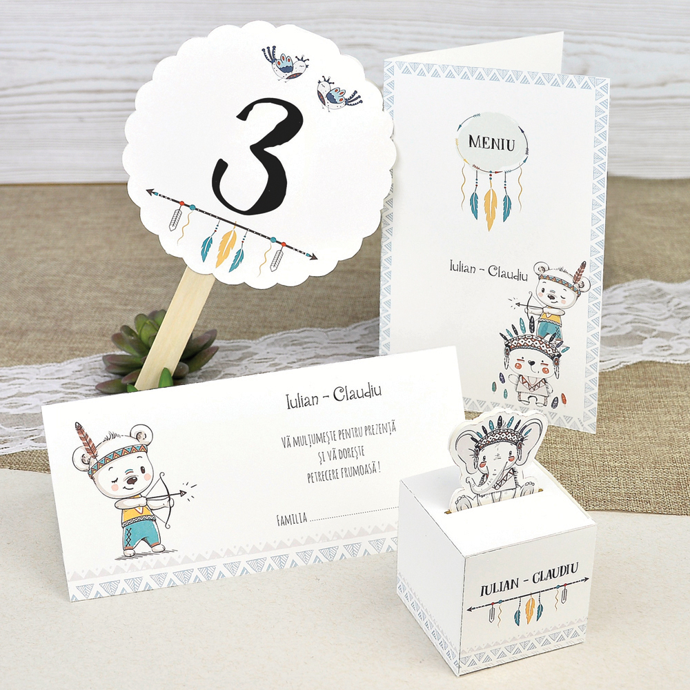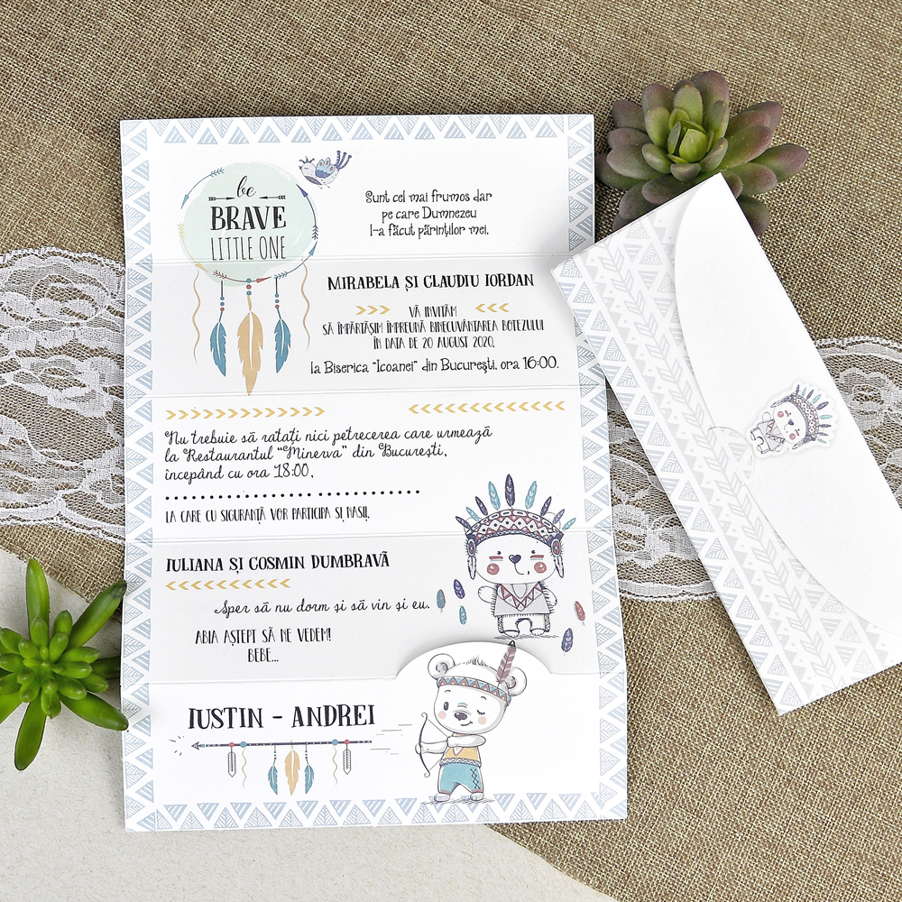 Invitatia se pliaza in cinci parti si are in loc de plic o cutie din carton, imprimata in aceeasi tematica ca si invitatia