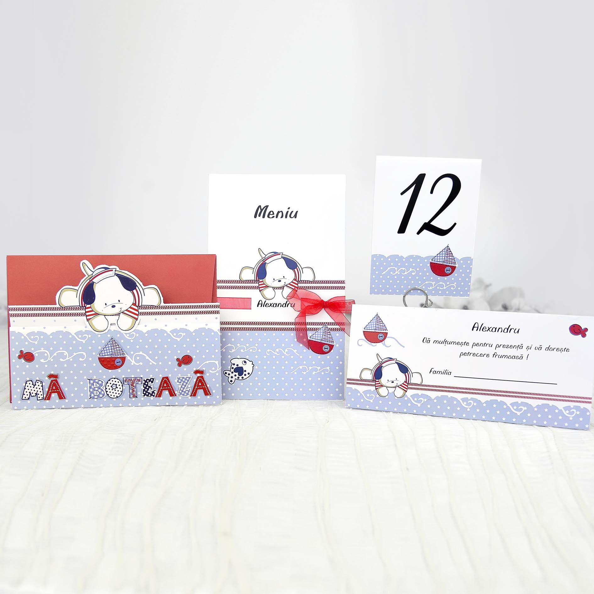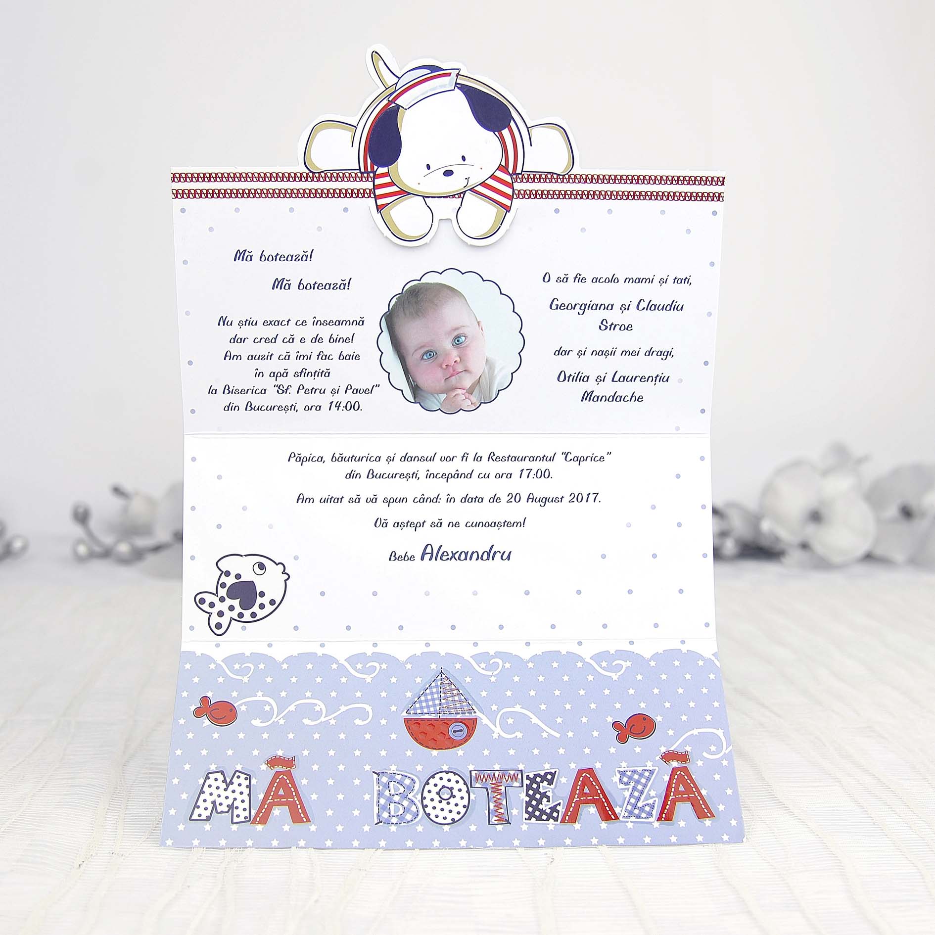 Motivele invitatiei sunt tematica marina, cu vaporas si pestisori iar jos este scris mare Ma boteaza