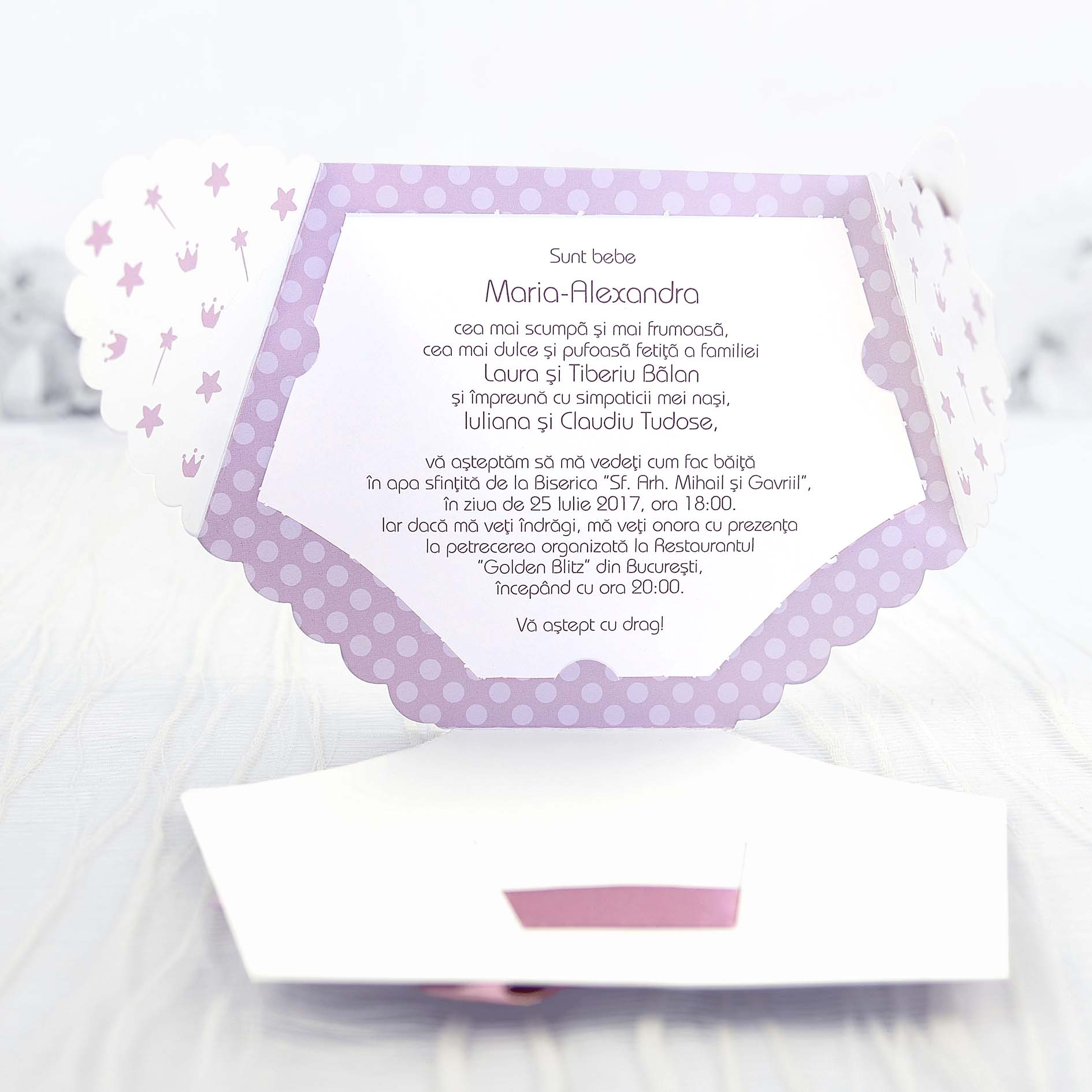 Invitatia are fundita din satin roz si se deschide, avand textul in interior