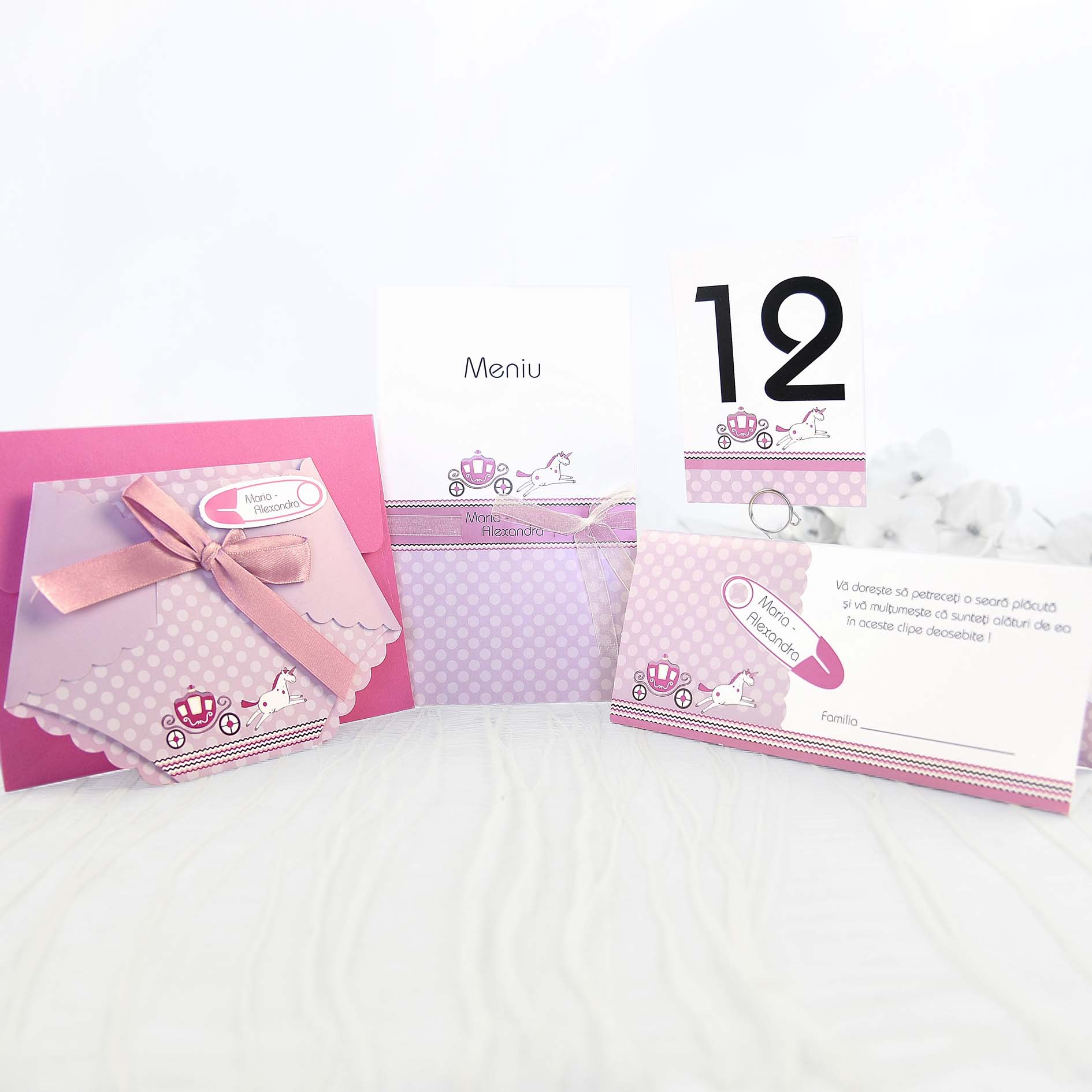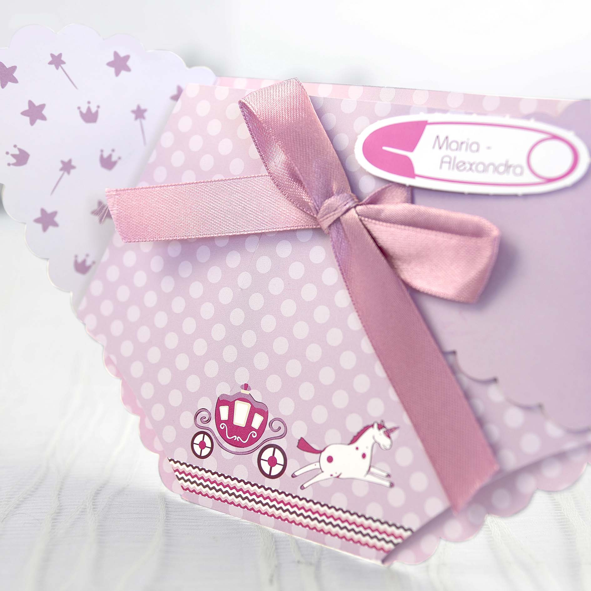 Invitatie pentru botez fetita in forma de scutecel pampers, roz, personalizat cu o caleasca cu unicorn si ac de siguranta care poate fi personalizat cu numele copilei sau data botezului