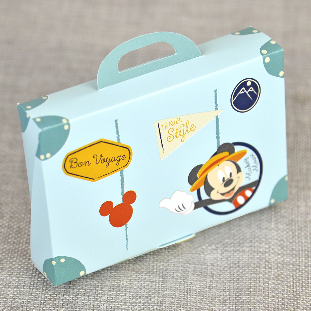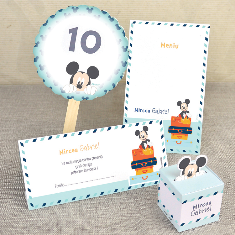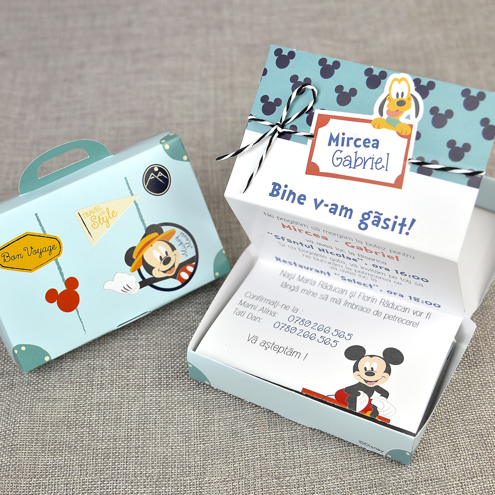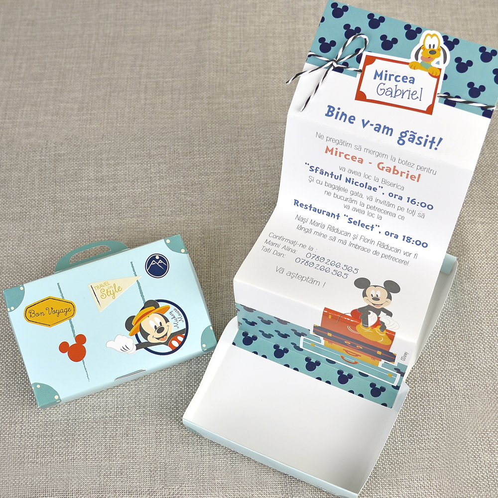 Invitatie botez colectia Disney pentru botez baietel, cu Mickey Mouse si Pluto si in loc de clasicul plic, invitatia are un geamantan bleu in care se pune invitatia