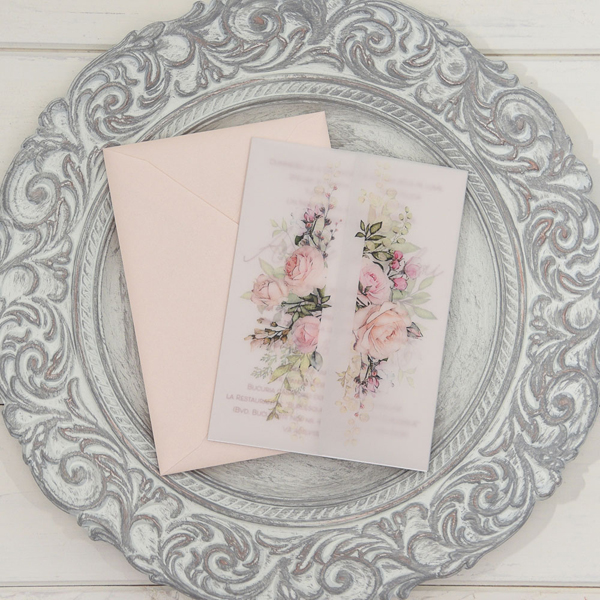 Invitatie nunta printata pe carton alb perlat de 300 g si invelita in hartie de calc cu grafica.