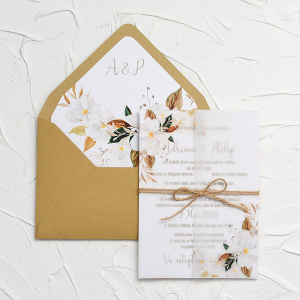 Invitatie nunta printata pe carton cu motive florale, cartonul cu textul invitatiei este invelit in foita de calc semitransparenta si legat cu sfoara, iar plicul este culoare maro-mustar, cu interior cu flori si este realizat manual