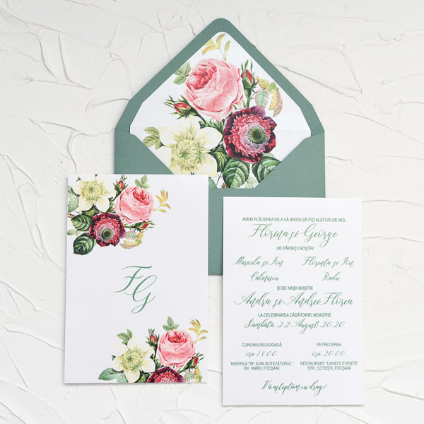 Invitatie nunta printata fata-verso pe carton cu motive florale si scris verde, plic personalizat lucrat manual, culoare verde cu interior cu flori