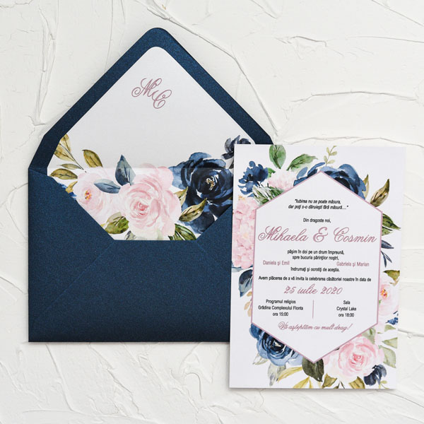 Invitatie nunta printata pe carton imprimat cu flori si plic bleumarin realizat manual, cu interior personalizat cu flori si initialele mirilor, inclus in pret