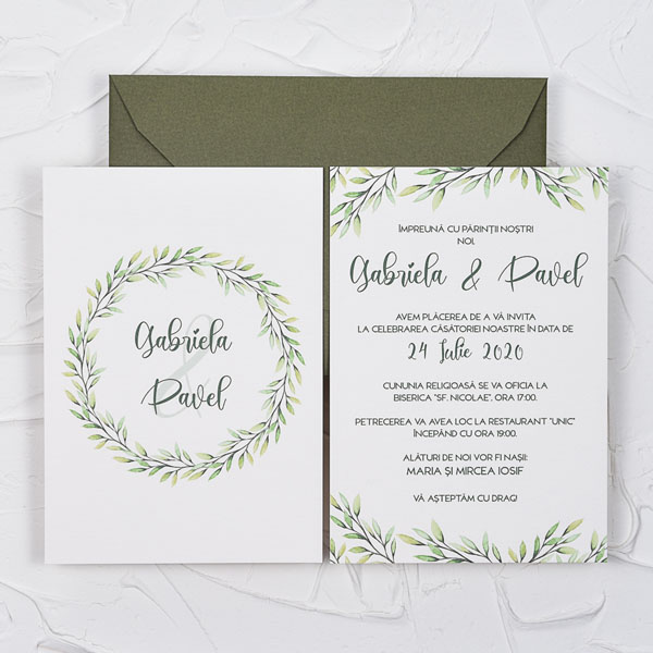 Invitatie nunta printata pe carton, fata verso cu frunze verzi si plic verde lucrat manual inclus in pret