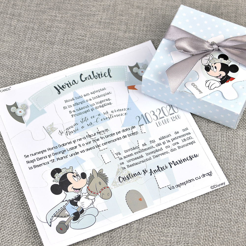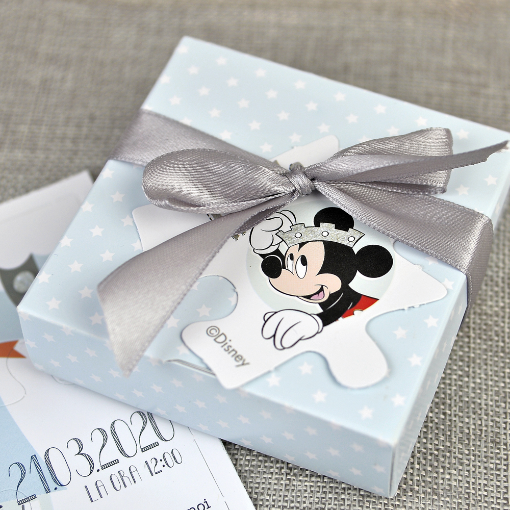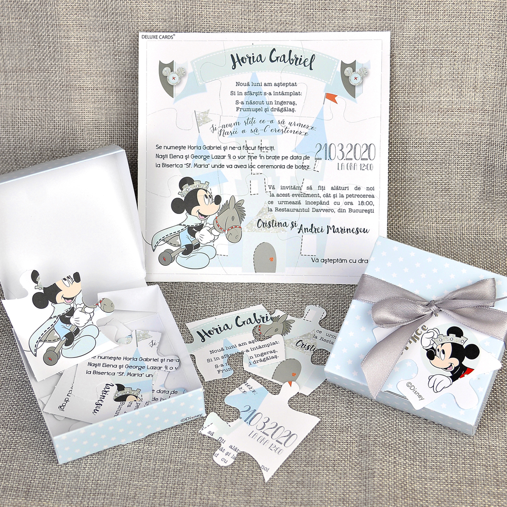 Invitatie botez colectia Disney pentru botez baietel, cu Mickey Mouse, in forma de puzzle si in loc de clasicul plic, invitatia are o cutiuta care se leaga cu fundita din satin gri
