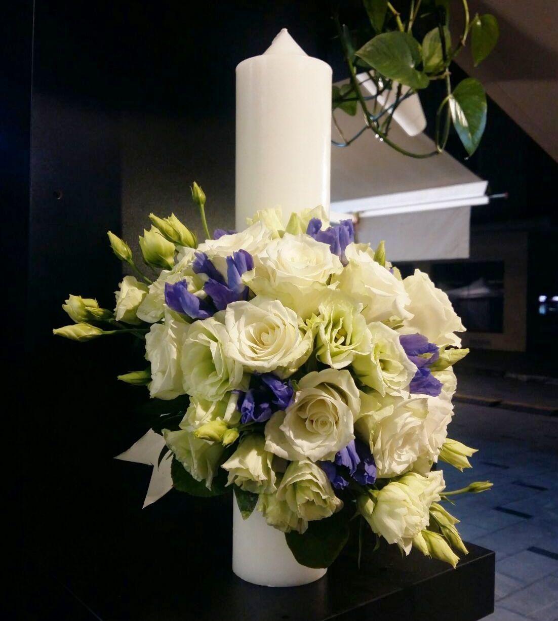 Lumanare botez cu aranjament asimetric in nunate de alb si mov, cu trandafiras si lisiantus