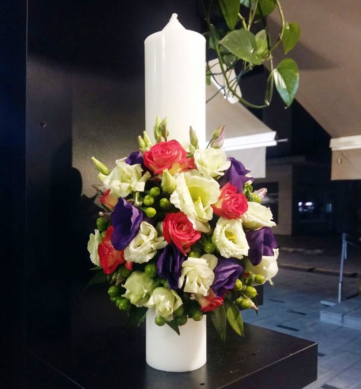 Lumanare botez cu aranjament rotund din lisiantus alb si mov, hypericum verde si trandafiri roz intens