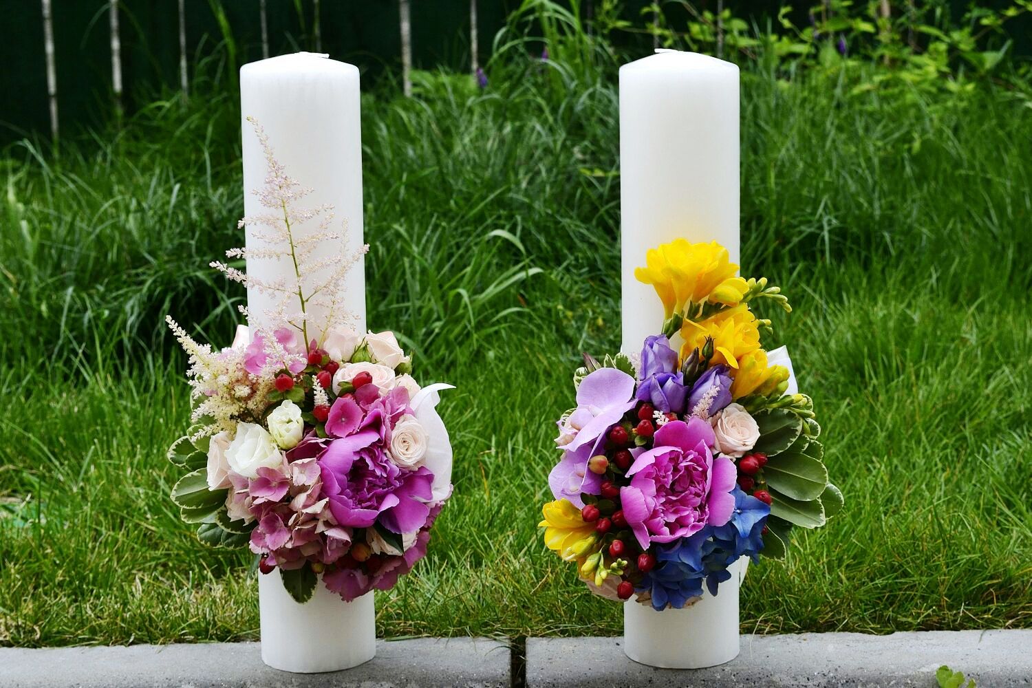 Lumanari botez pentru gemene, realizate din flori delicate, combinatia cromatica le da o nota de eleganta: frezia, hortensia, bujori, lisiantus, orhidee, trandafirasi, lisiantus