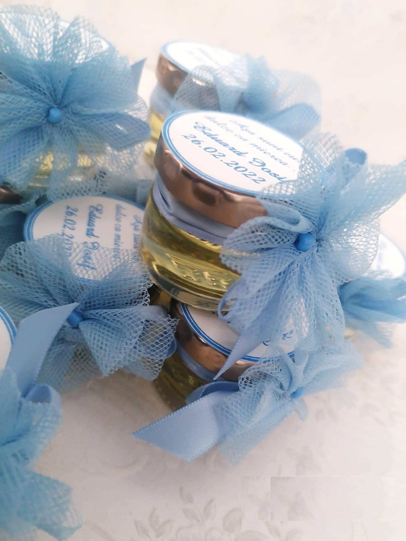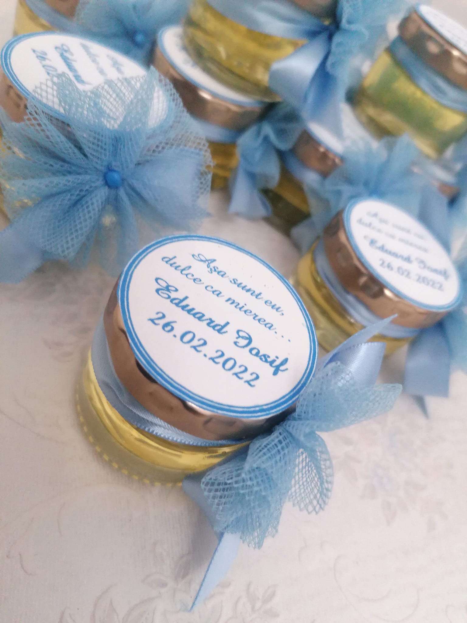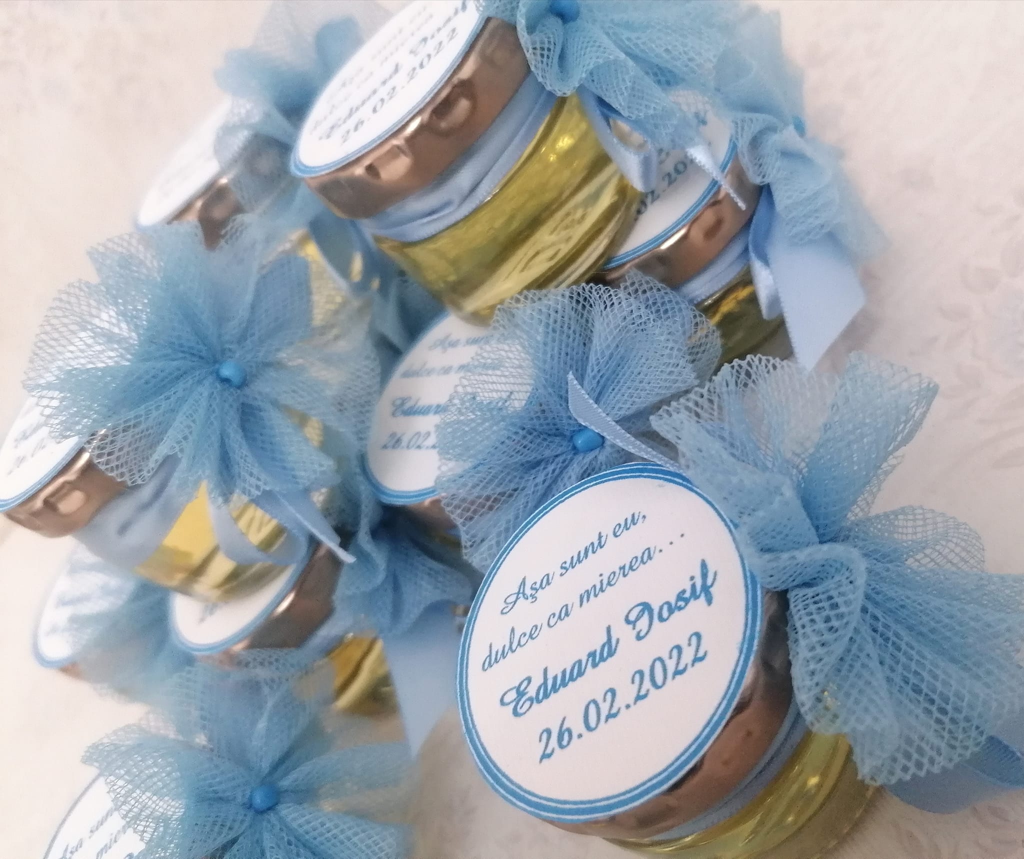 Marturie borcanel cu miere pentru botez baietel decorat cu un pamponas din tulle bleu, cu margeluta legat cu fundita din satin bleu la gatul borcanului
