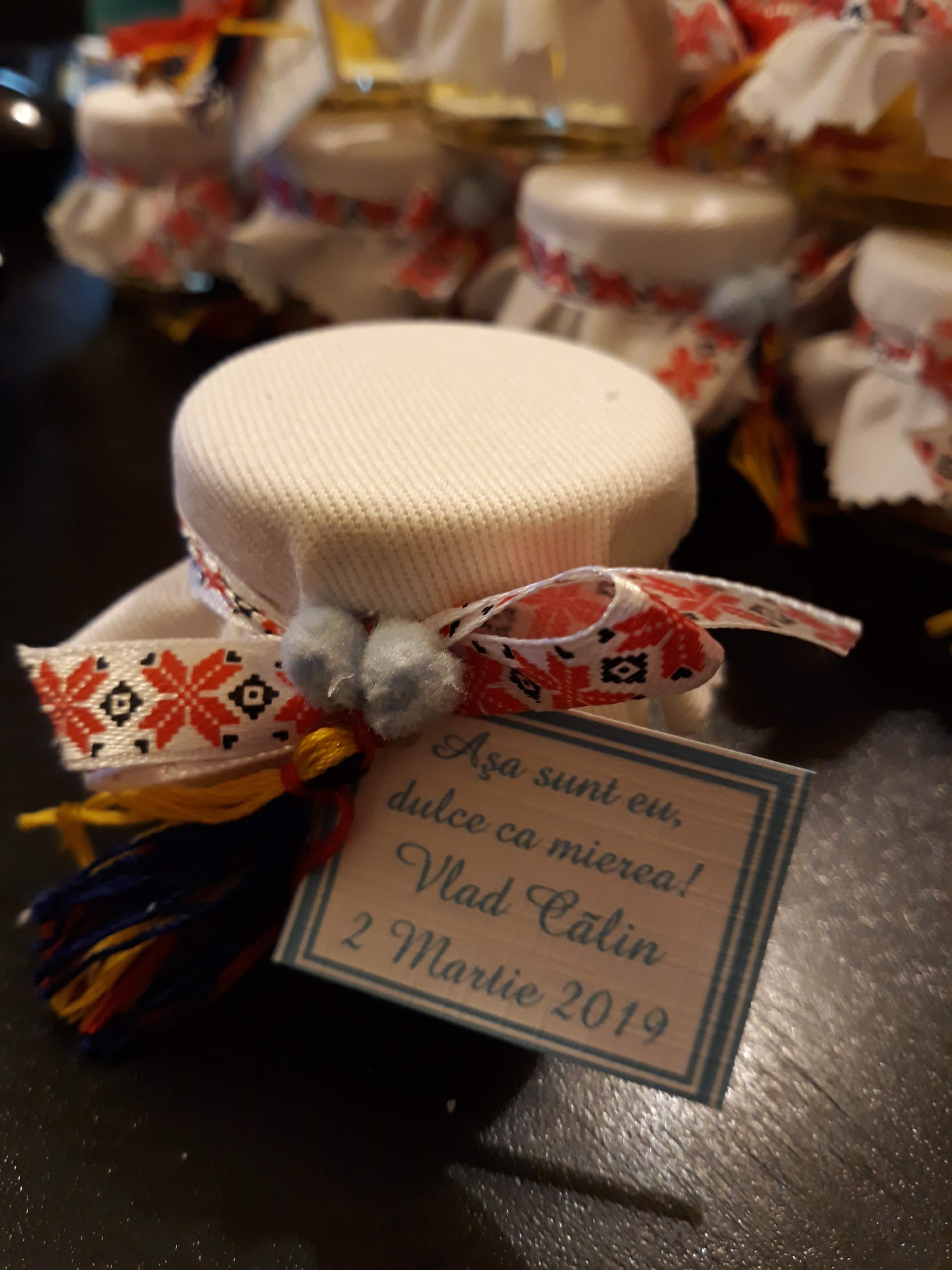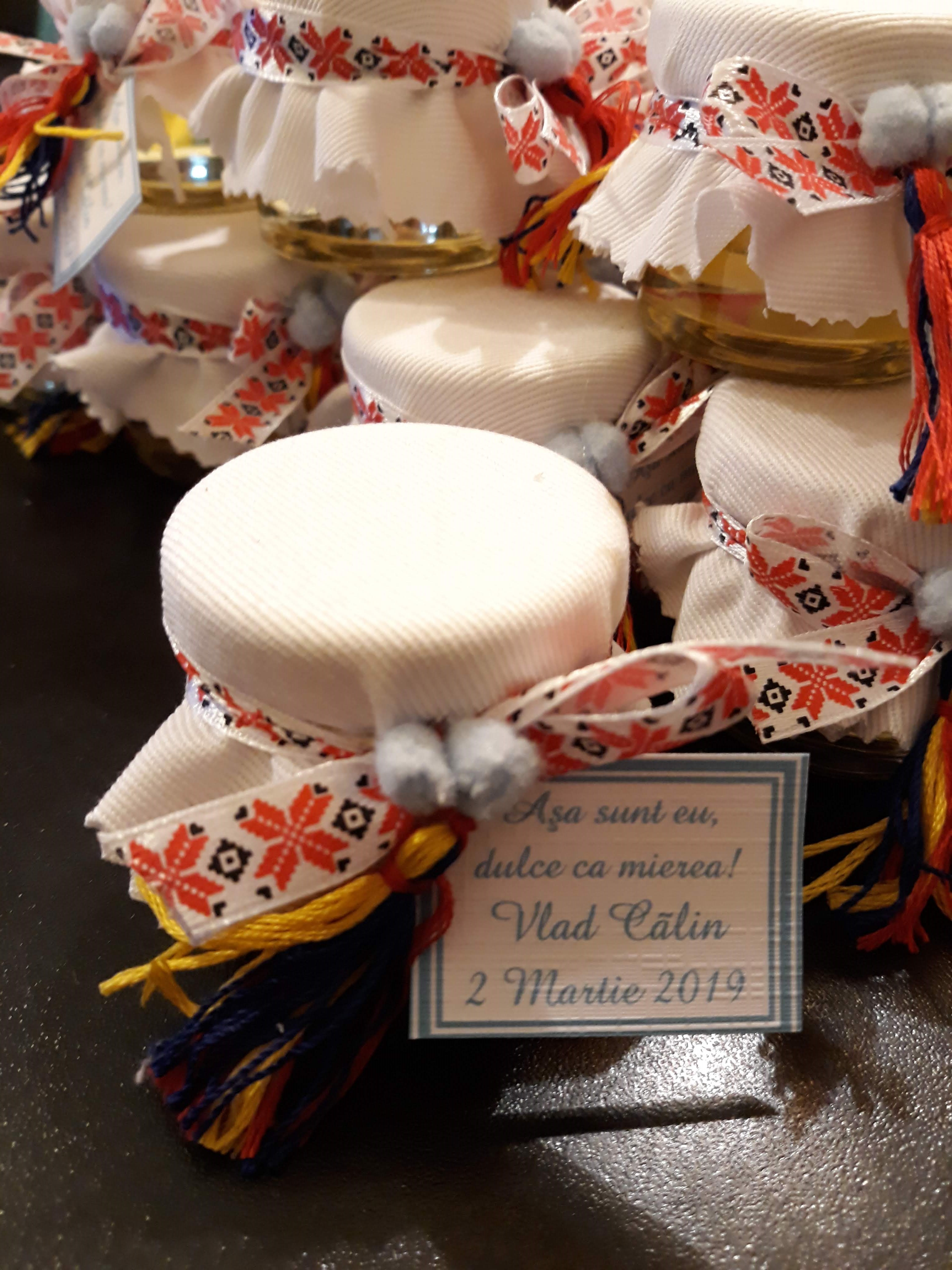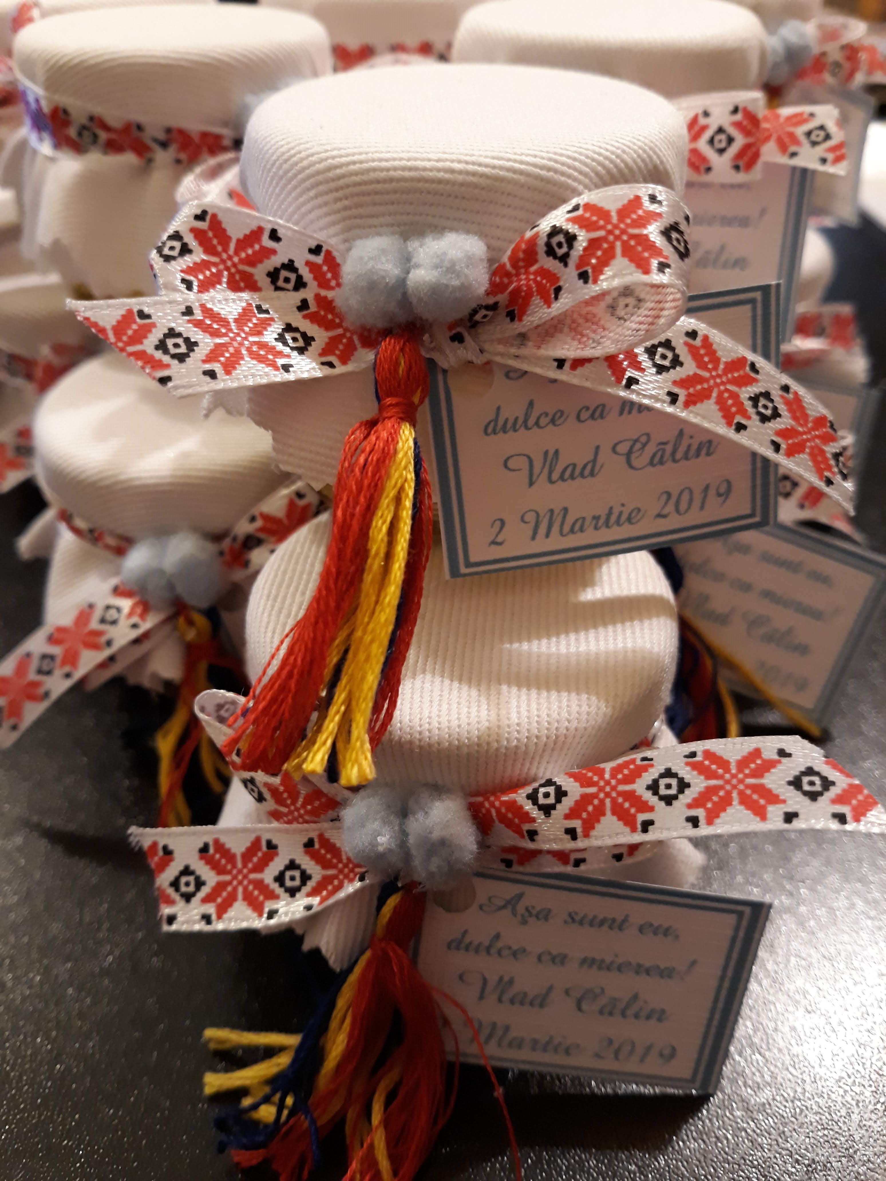 Marturie pentru botez baietel sau fetita borcanel cu miere poliflora decorat in tematica traditionala romaneasca, acest model se potriveste atat fetitelor cat si baieteilor