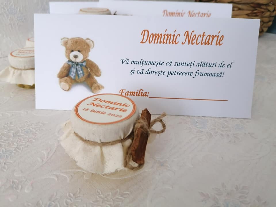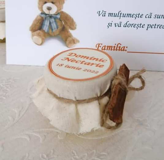 Marturie borcanel cu miere pentru botez bauetele, cu capacul imbracat in panza, legata cu sfoara si betisor de scortisoara
