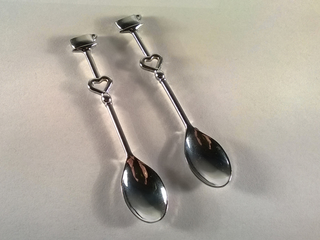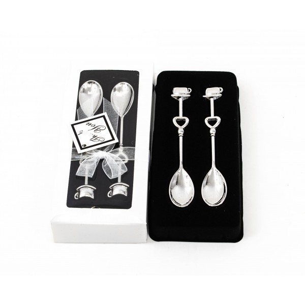 Marturie pentru nunta set doua lingurite argintii, cu manere cu model inimioare, ambalate in cutie alba si legate cu fundita din organza alba si biletel cu text For You
