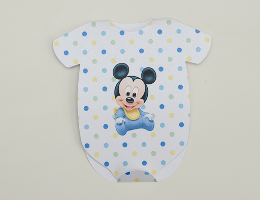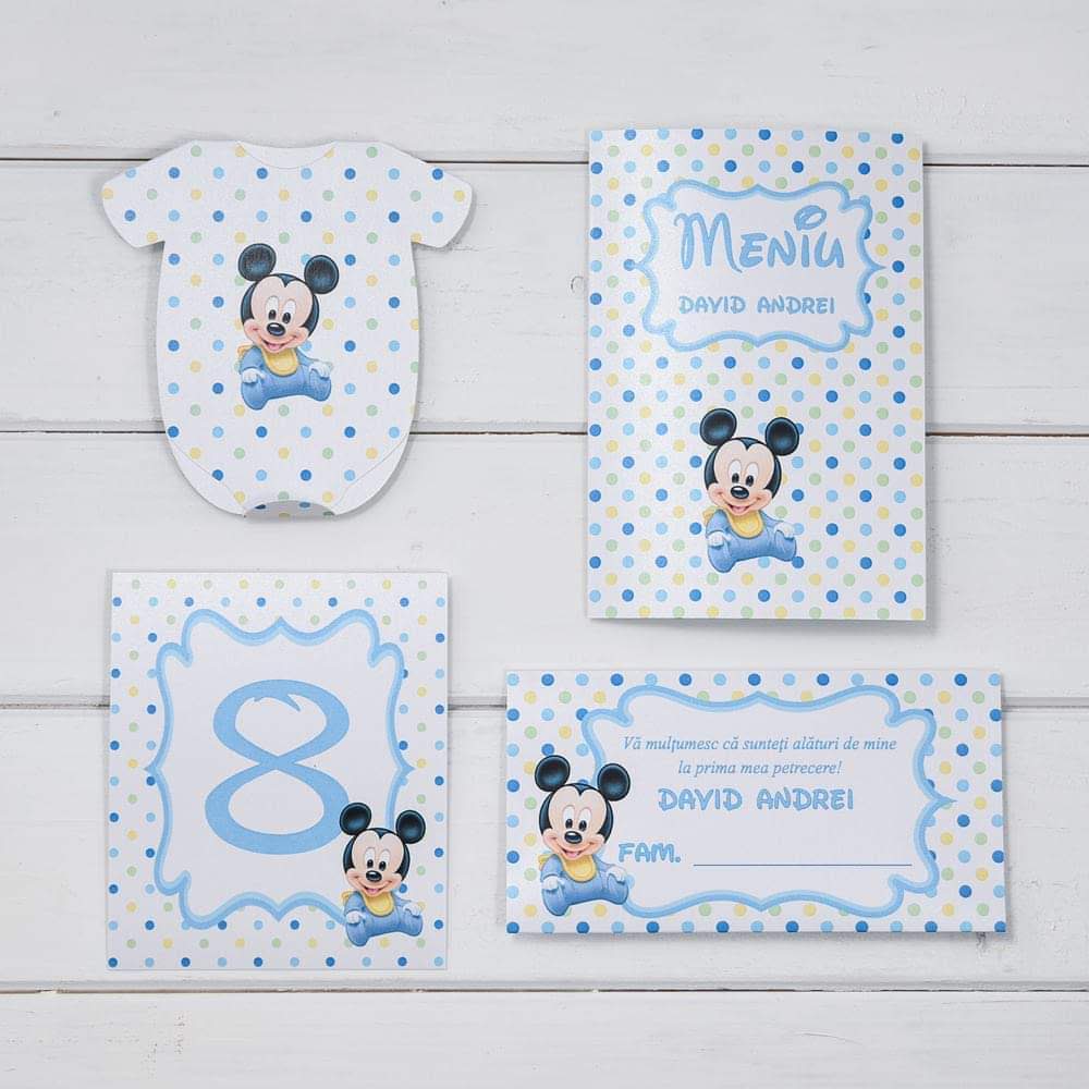 Card de masa cu plic de bani pentru botez baietel, realizat din carton alb sidefat, personalizat cu bleu, galben si verde si cu Baby Mickey