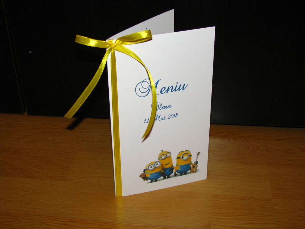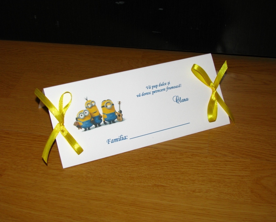 Card de masa botez cu plic de bani, realizat manual din carton alb sau crem, personalizat cu Minioni, accesorizat cu fundite.