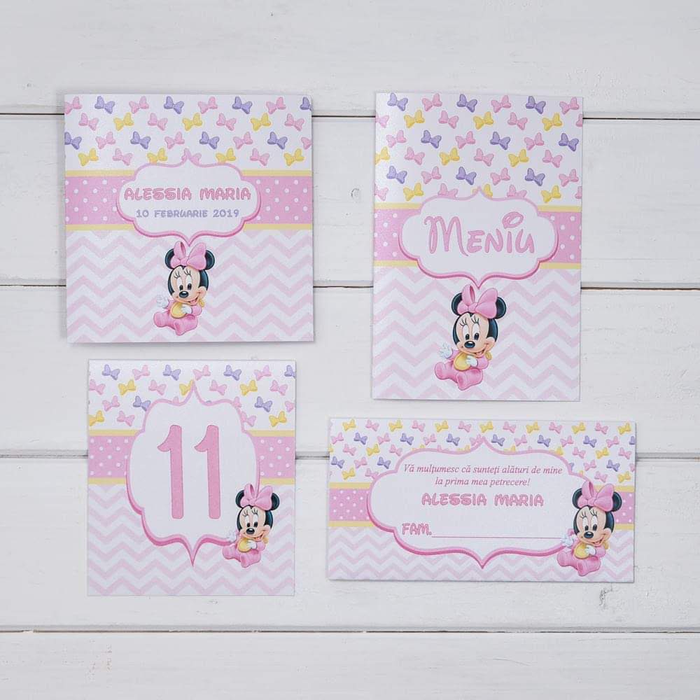 Card de masa cu plic de bani pentru botez fetita, realizat din carton alb sidefat, personalizat cu roz si cu Baby Minnie