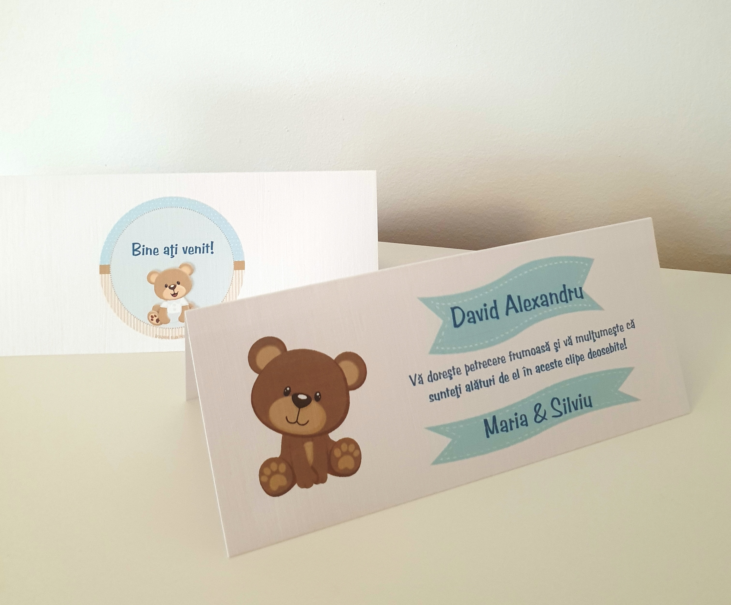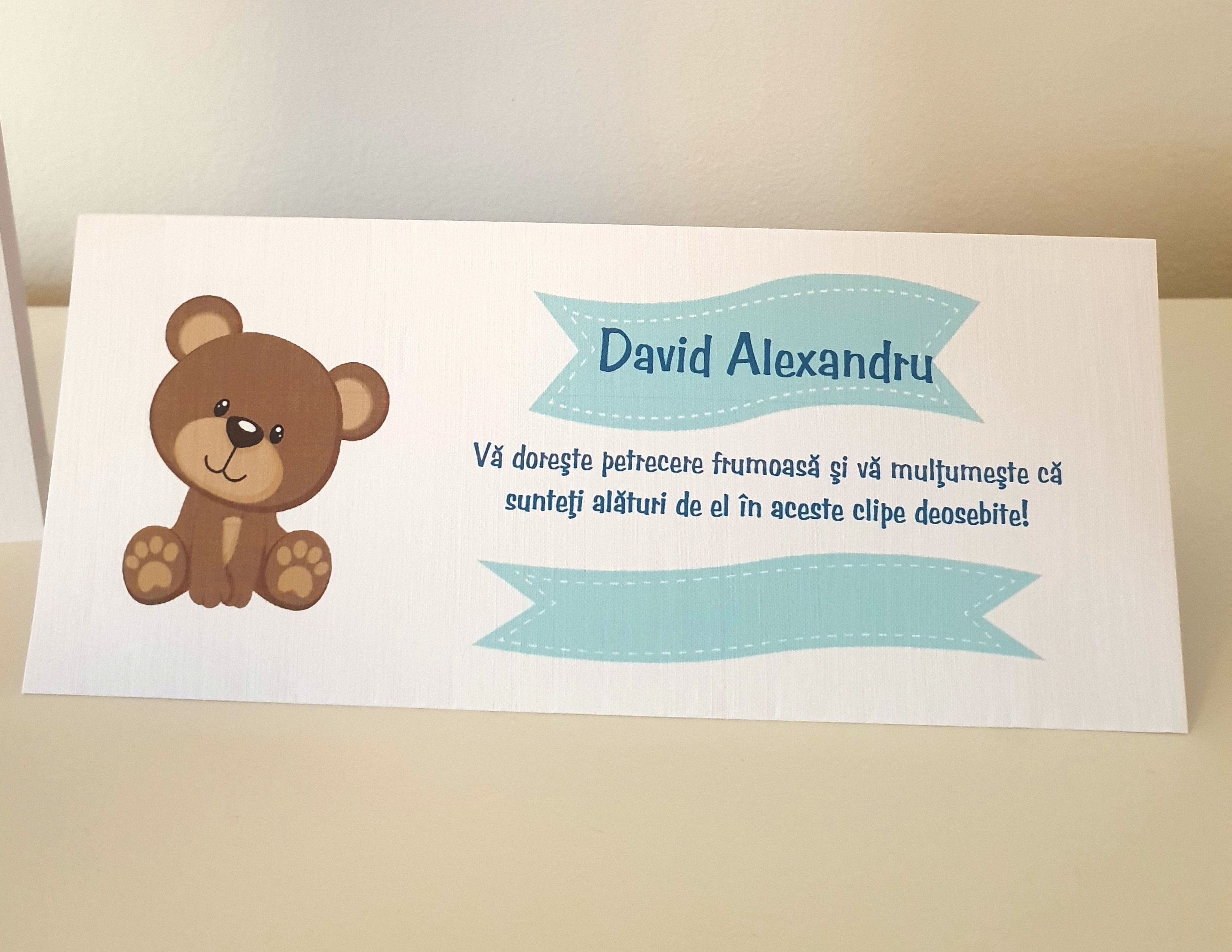 Card de masa cu plic de bani din carton alb sau crem, personalizat cu ursulet