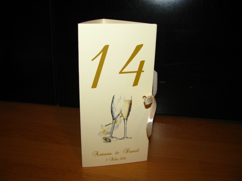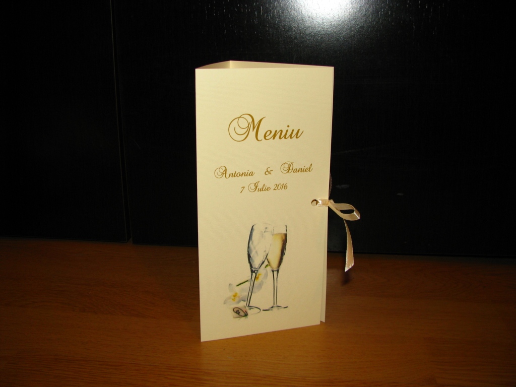 Card de masa pentru nunta cu plic de bani, realizat manual din carton alb sau crem, personalizat cu numele mirilor, mesaj si poza cupe de sampanie.