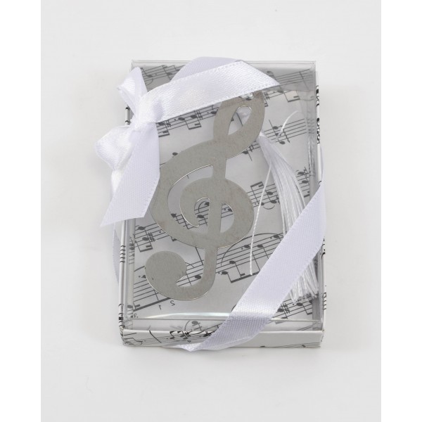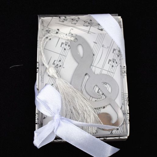 Semn de carte cheia sol, marturie nunta, din metal cu ciucure negru, in cutie din carton cu tematica portativ si capac transparent din plasitc, fundita alba