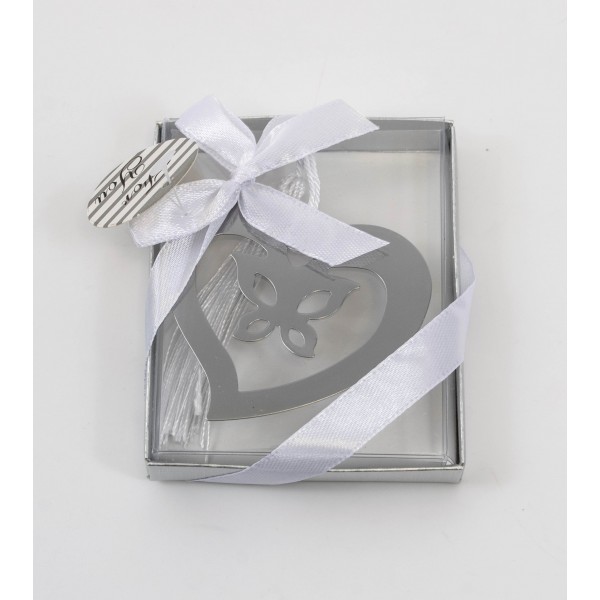 Marturie semn de carte in forma de inima, din metal, cu ciucurel alb, ambalata in cutie din carton cu capac transparent si accesorizata cu fundita