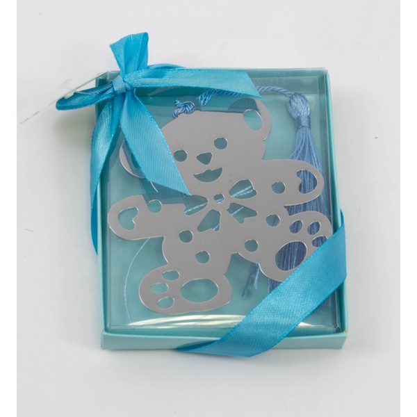 Marturie botez semn de carte in forma de ursulet, din metal, cu ciucurel bleu