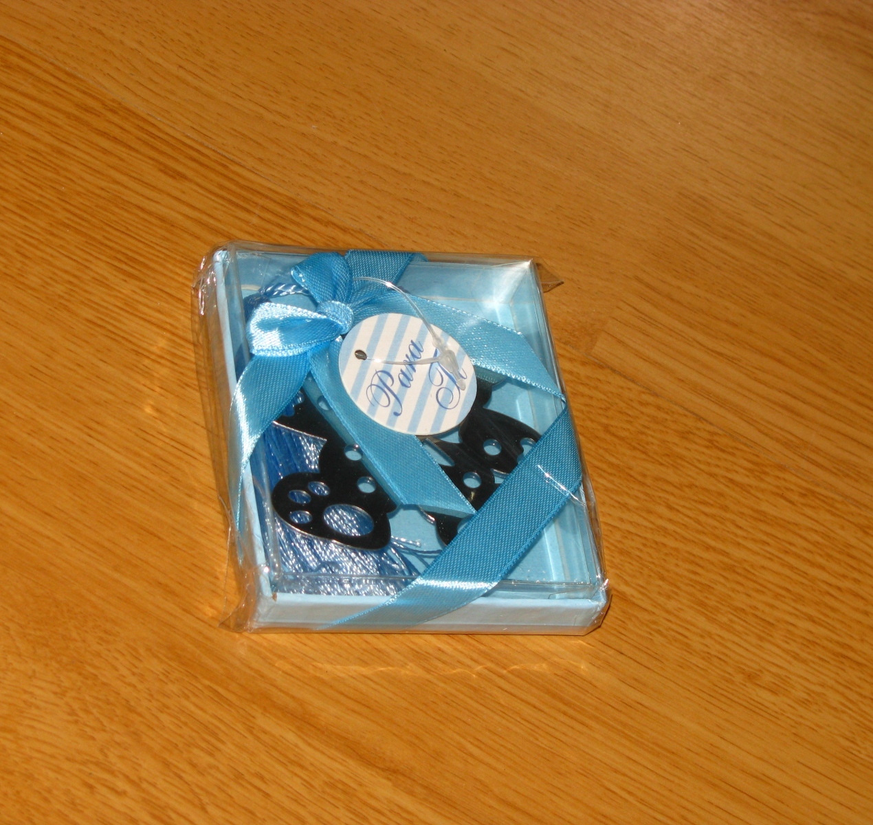 Marturia se livreaza in cutie din carton bleu cu capac transparent si fundita bleu din satin, tot produsul este ambalat in punguta din folie transparenta